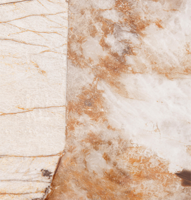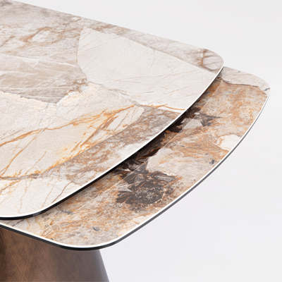 eine glänzende Keramikplatte in Patagonia-Optik mit einer Unterlage aus gehärtetem Glas, die ihn besonders widerstandsfähig macht und gleichzeitig für eine starke optische Wirkung sorgt;