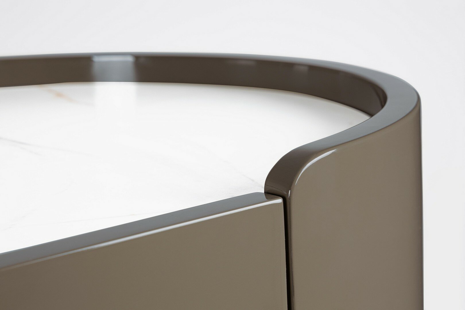 GESTELL AUS MDF, SINTERSTEINPLATTE (HOCHTEMPERATURBEARBEITETER NATURSTEIN). OBERFLÄCHE AUF BASIS VON POLIURETANLACK MIT POLIERTEM EFFEKT. TÜREN MIT GEDÄMPFTEM VERSCHLUSS. INNENABLAGE.
