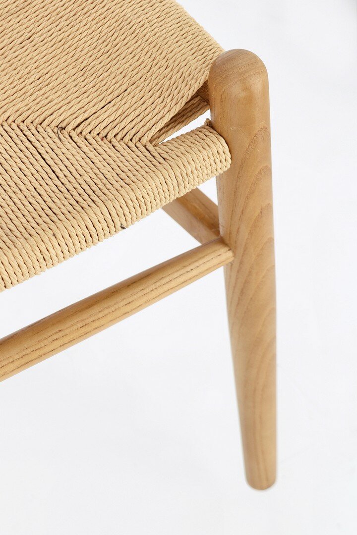 GESTELL AUS ULMENHOLZ, SITZFLÄCHE AUS NATURFASER, FEINBEARBEITUNG AUS POLYURETHAN. VERPACKUNG OHNE KARTON
