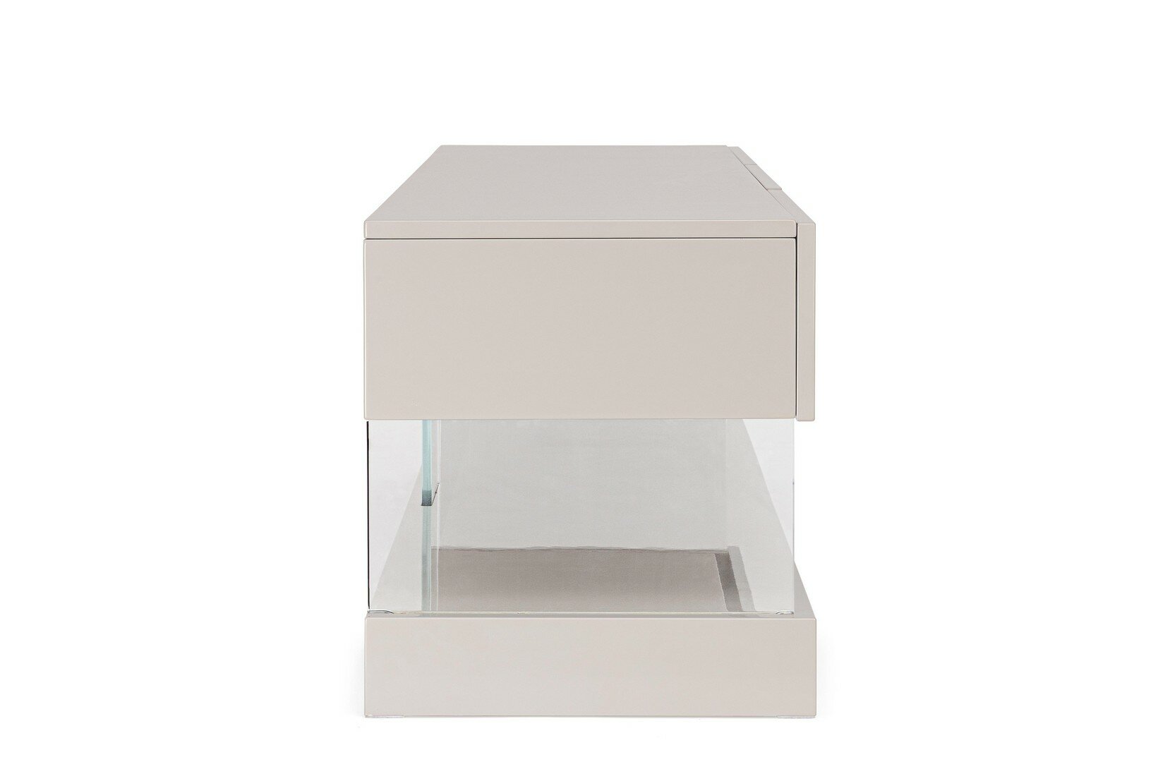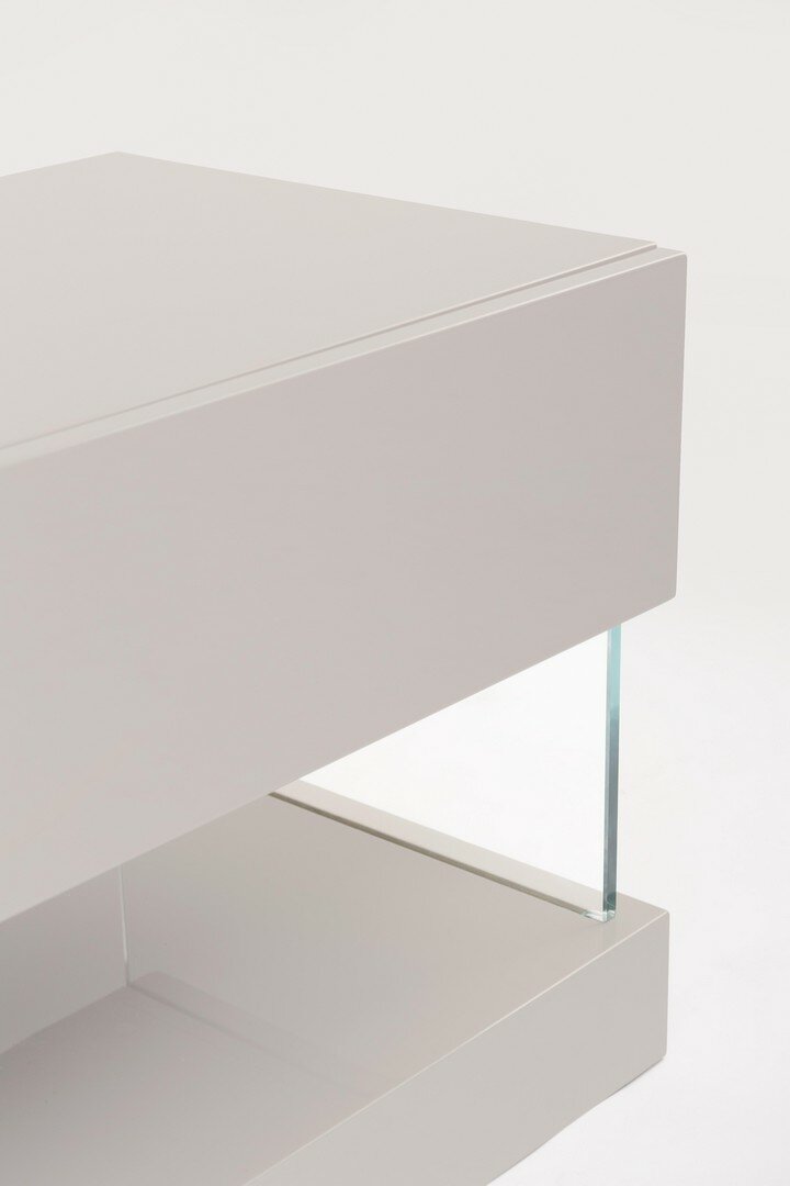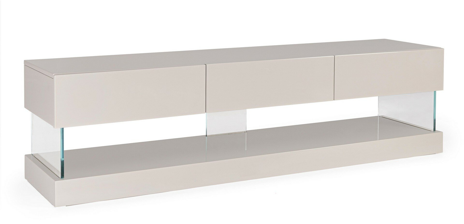 STRUKTUR AUS MDF. GLÄNZEND LACKIERTE OBERFLÄCHE AUF BASIS VON POLYURETHANLACK. RÜCKENLEHNE AUS SPANPLATTE MIT MELAMINPAPIER- BESCHICHTUNG. UNTERSTÜTZUNGEN DER OBEREN EBENE AUS GEHÄRTETEM GLAS (“SUPER WEISS”). SCHUBLADEN MIT GEDÄMPFTEM VERSCHLUSS. UNTERSTÜTZUNGEN DER GLÄSER UND DER OBEREN EBENE ZU MONTIEREN.