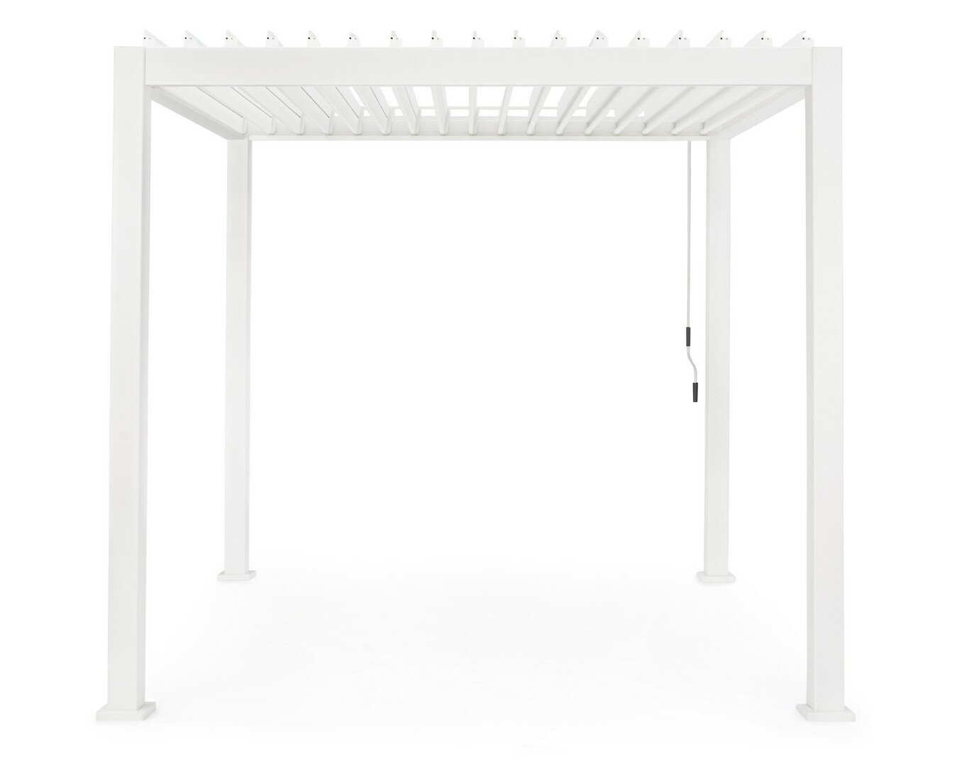 STRUCTURE IN POWDER-COATED ALUMINIUM (POLYESTER). SUPPORTING POLES 111X111MM, CROSSPIECES 140X75MM. GALVANIZED STEEL LAMELLAR ROOF ADJUSTABLE BY CRANK.SUNSHADE BLADES 173X30MM. WATER FLOW SYSTEM INTEGRATED INSIDE THE SUPPORTING POLES. STAINLESS STEEL SCREWS. TO BE ASSEMBLED.