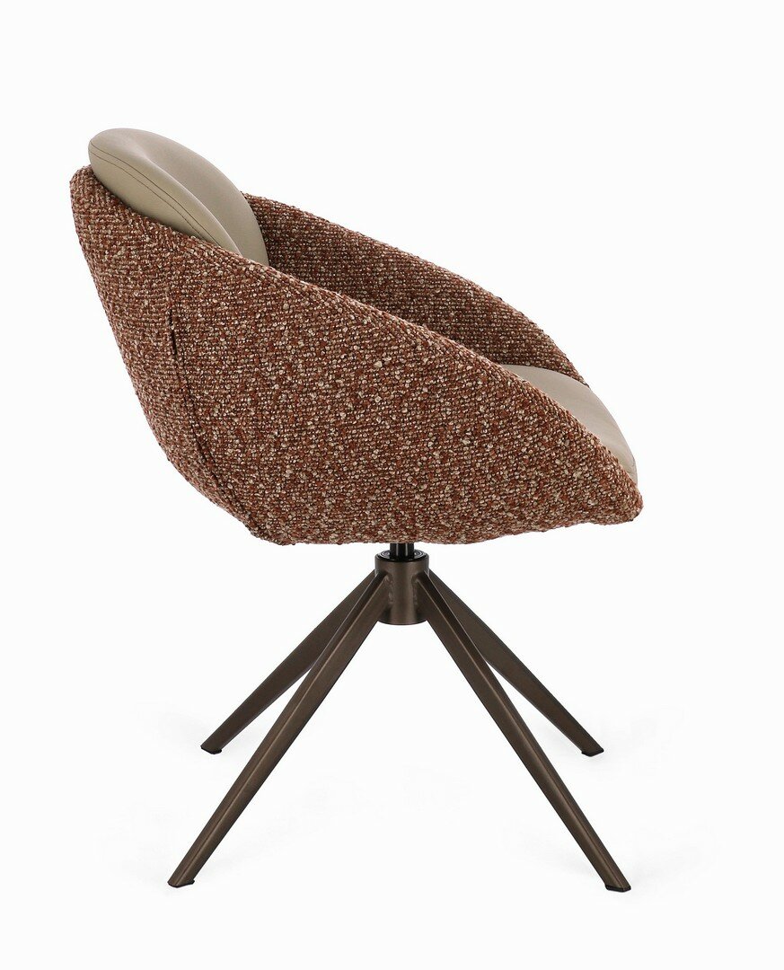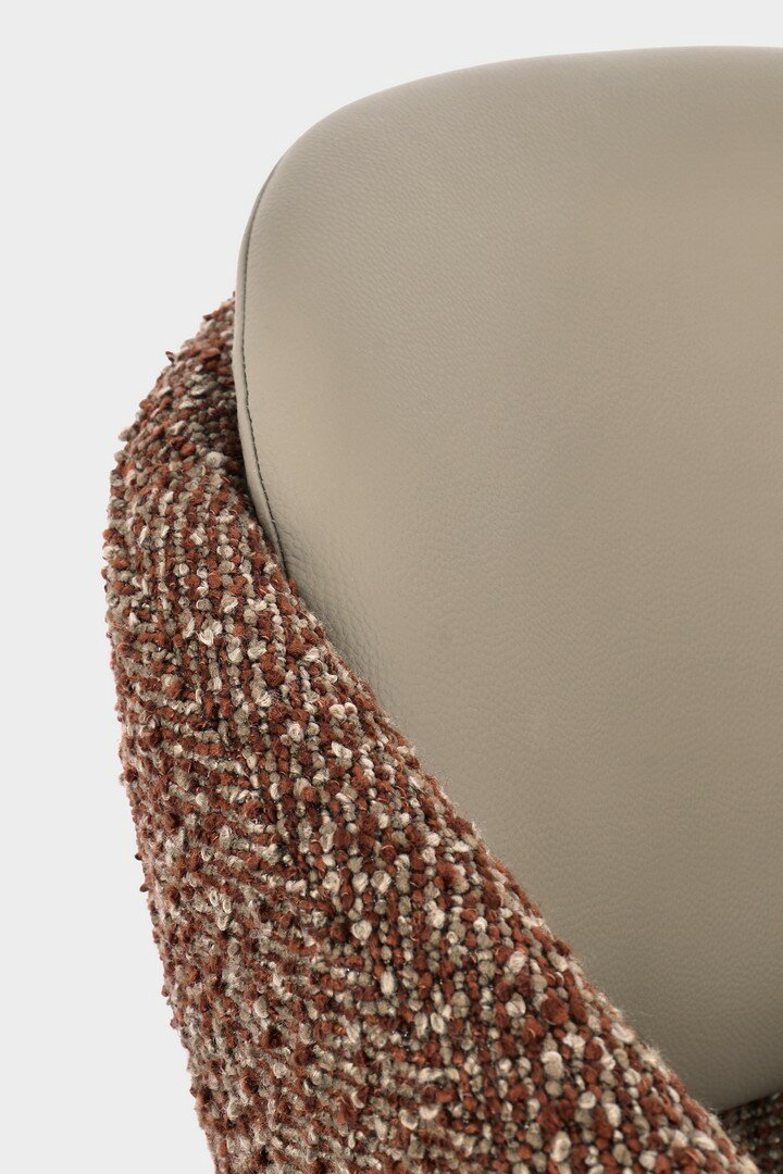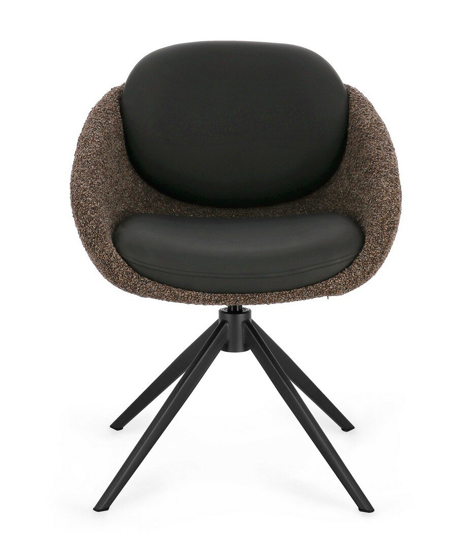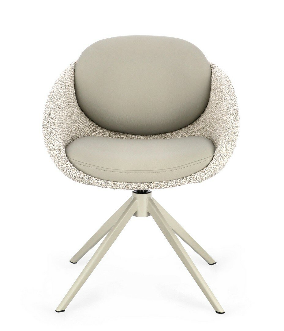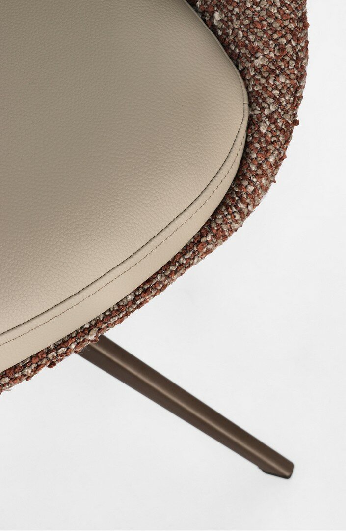 PLYWOOD STRUCTURE COVERED IN BOUCLÉ-EFFECT POLYESTER FABRIC. CUSHIONS COVERED IN IMITATION LEATHER WITH SEAT DENSITY POLYURETHANE FOAM PADDING 24KG/M3 BACKREST 21KG/M3. EPOXY POWDER PAINTED STEEL LEGS. 360° SWIVEL WITH RETURN. LEGS TO BE ASSEMBLED.