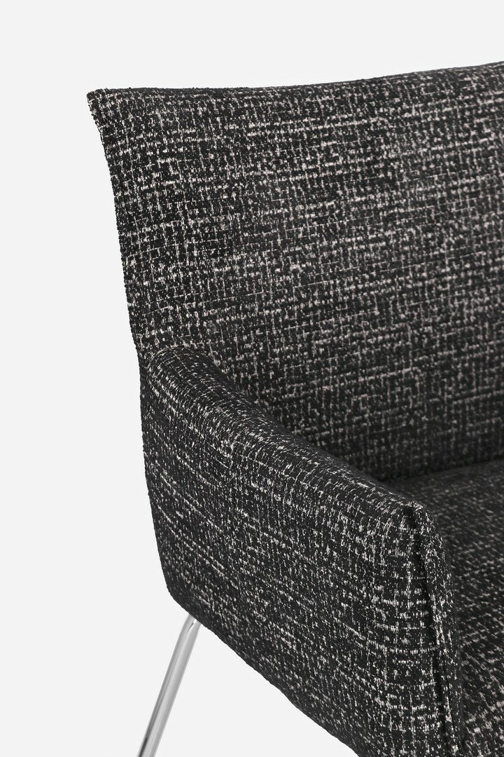 STEEL STRUCTURE EPOXY POWDER COATED. SEAT IN PLYWOOD WITH LINING IN POLYESTER, KNITTED TWEED EFFECT WIDE. FOAM PADDING POLYURETHANE (DENSITY 24KG/M3 SEAT, 16KG/M3 BACKREST). LEGS TO BE ASSEMBLED.