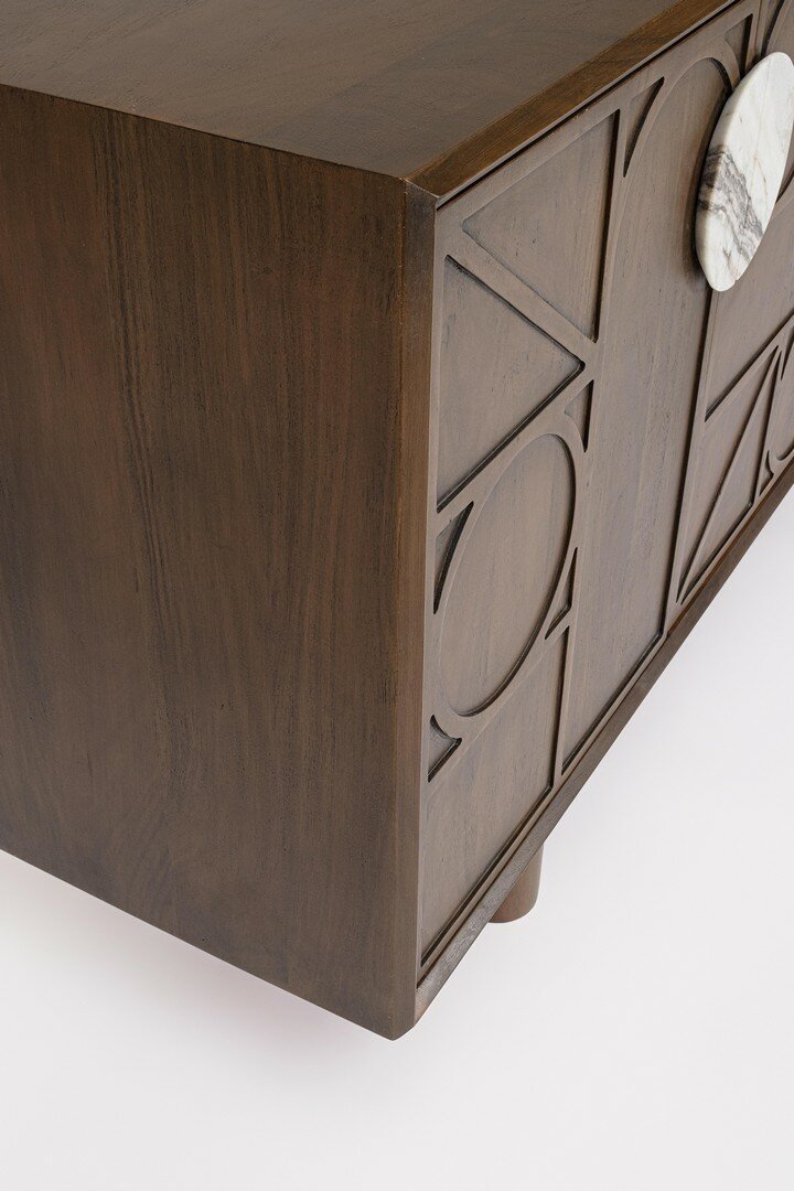 STRUCTURE AND LEGS IN ACACIA WOOD. FINAL FINISH WITH WATER-BASED PAINT. MARBLE HANDLES. DOOR COMPARTMENT INCLUDING SHELF, WITH SOFT CLOSING HINGES. LEGS TO BE ASSEMBLED.