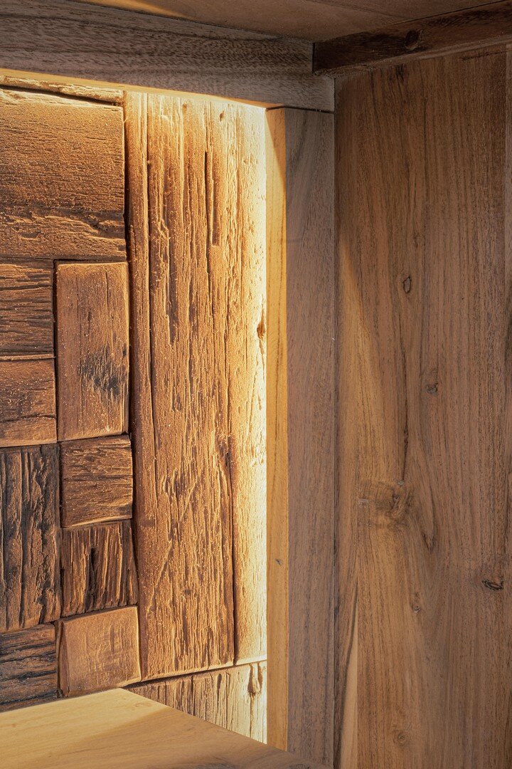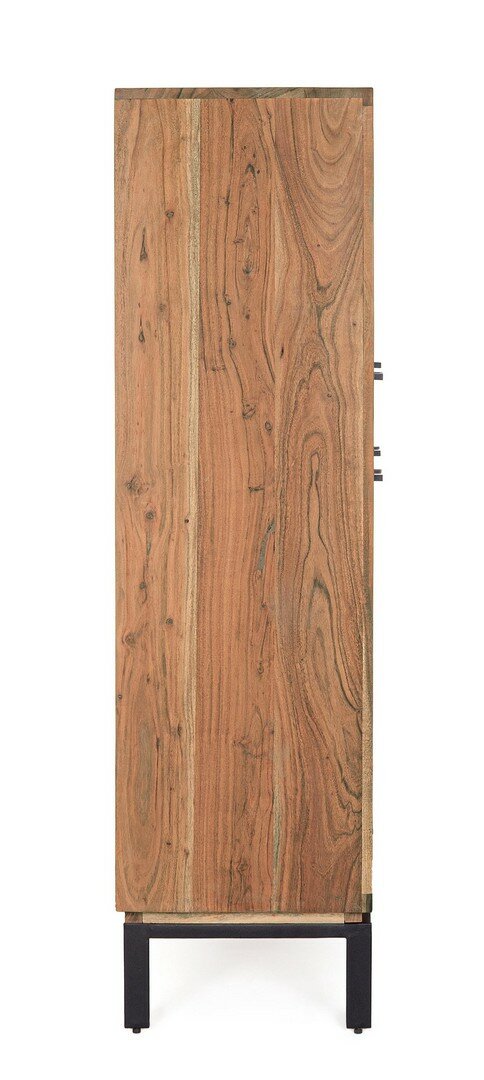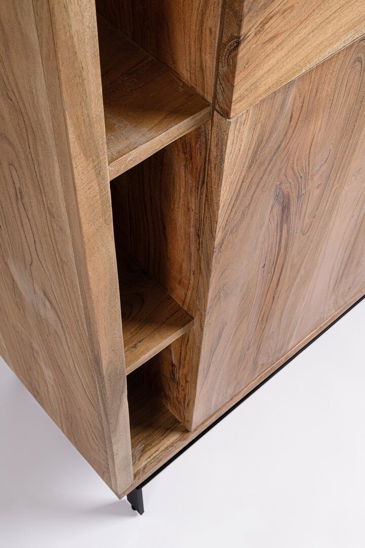 STRUCTURE IN ACACIA WOOD, PLYWOOD BACKS, INSIDE EXPOSED INSIDE IN RECYCLED WOOD. ACRYLIC PROTECTIVE FINISH. HINGED DOORS WITH SOFT CLOSING. HANDLES AND STEEL LEGS. DOOR COMPARTMENT INCLUDING SHELF. LEGS TO BE ASSEMBLED.