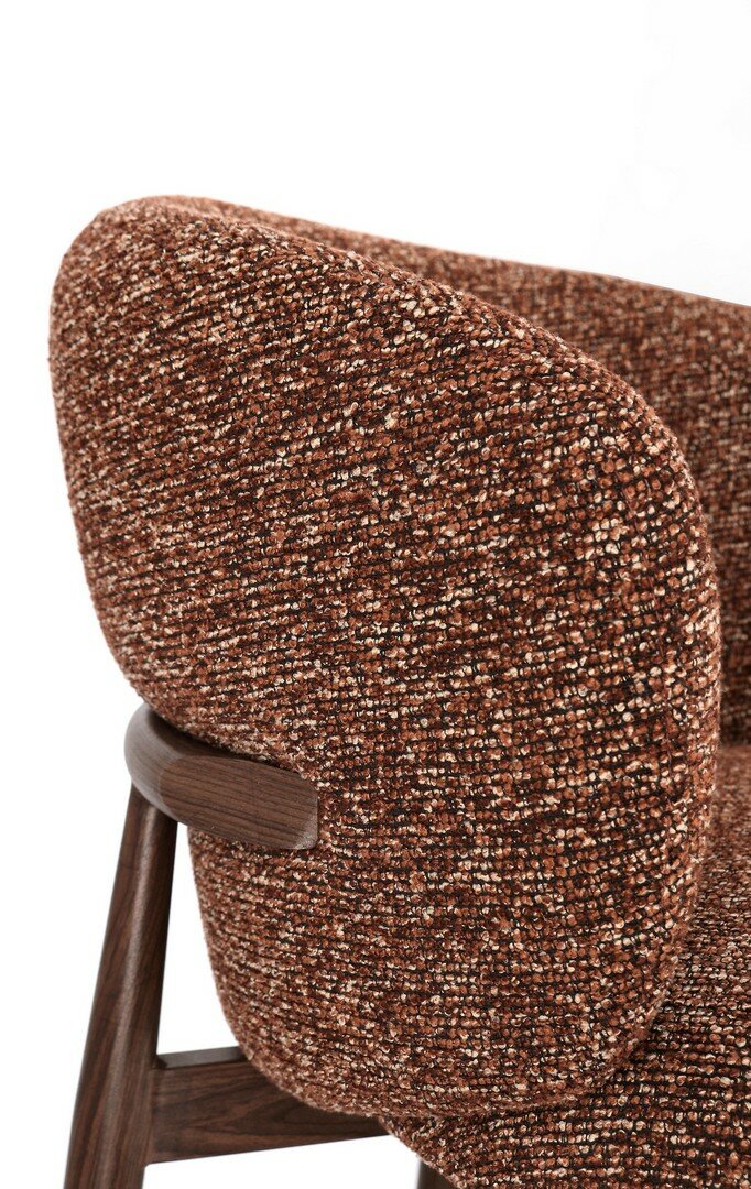 EPOXY POWDER COATED STEEL STRUCTURE, WOOD EFFECT. SEAT AND BACK WITH POLYESTER COATING, BOUCLE’ EFFECT. DENSITY OF POLYURETHANE FOAM PADDING SEAT 24-28KG/M3, BACK 22-24KG/M3. LEGS TO BE ASSEMBLED.