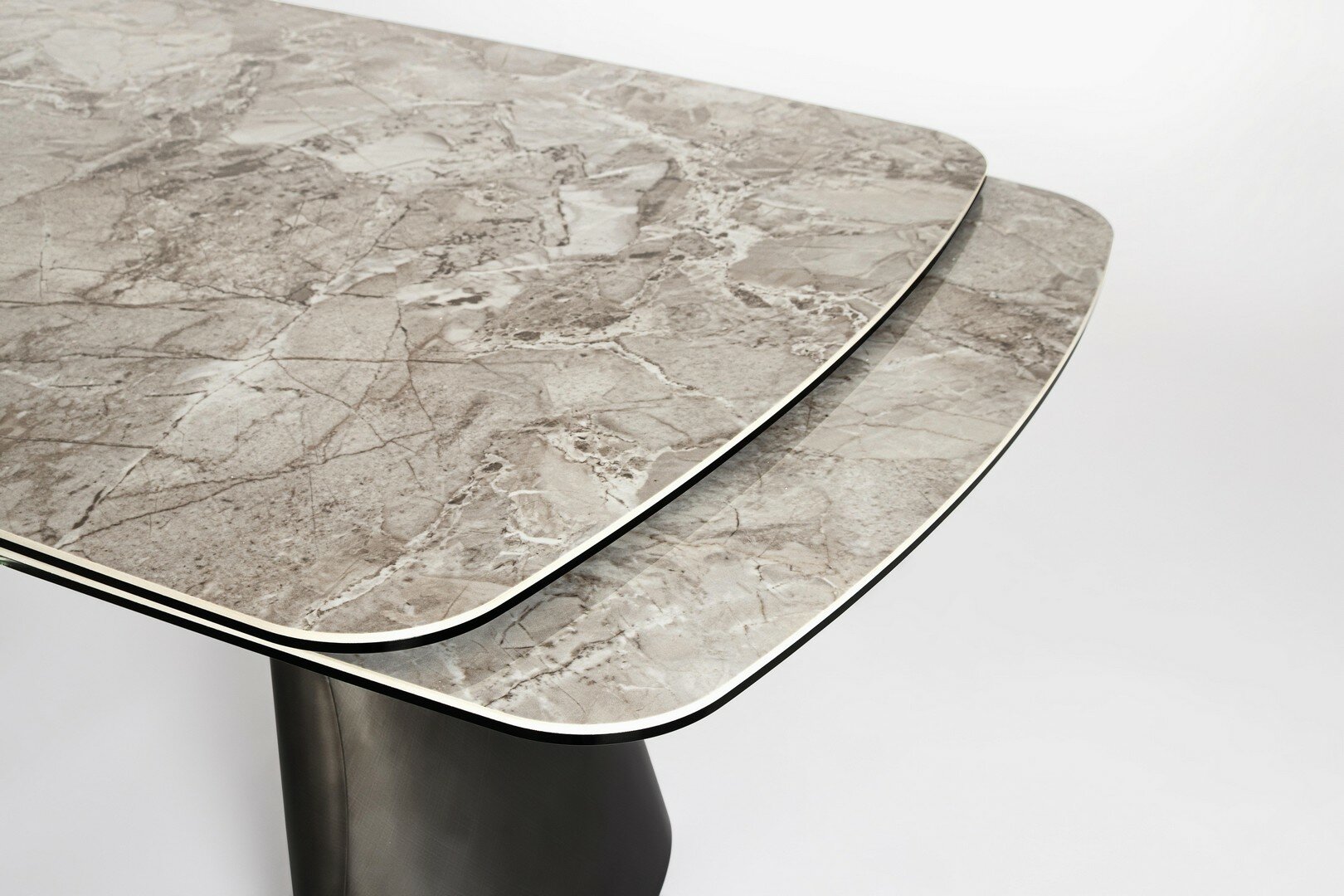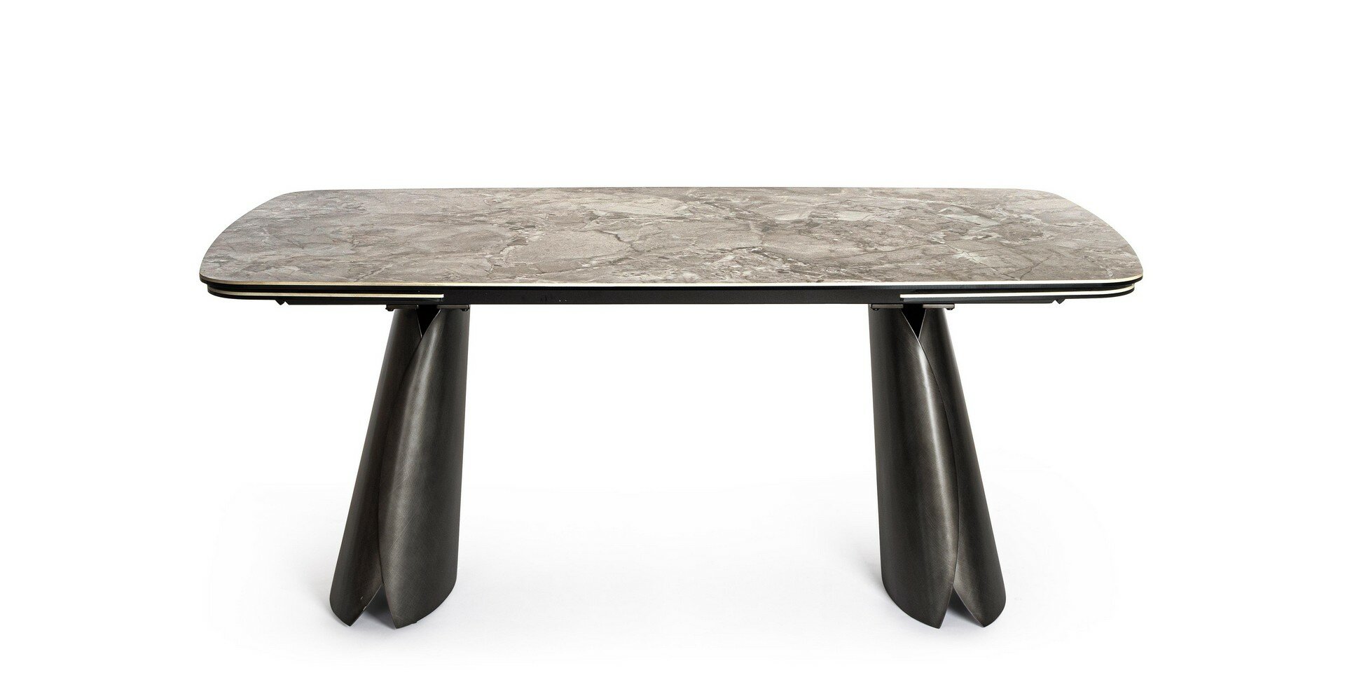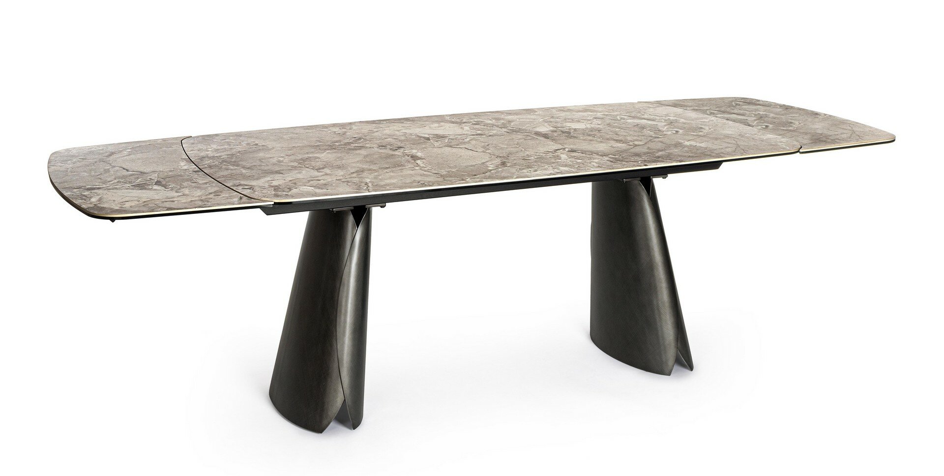 GLOSSY CARNIC GREY EFFECT CERAMIC TOP AND LOWER LAYER OF TOP IN TEMPERED GLASS.TOP SUPPORT IN EPOXY POWDER COATED STEEL. LEGS IN BRUSHED STEEL WITH DARK SILVER EFFECT. INDEPENDENT EXTENSIONS. LEGS TO BE ASSEMBLED.