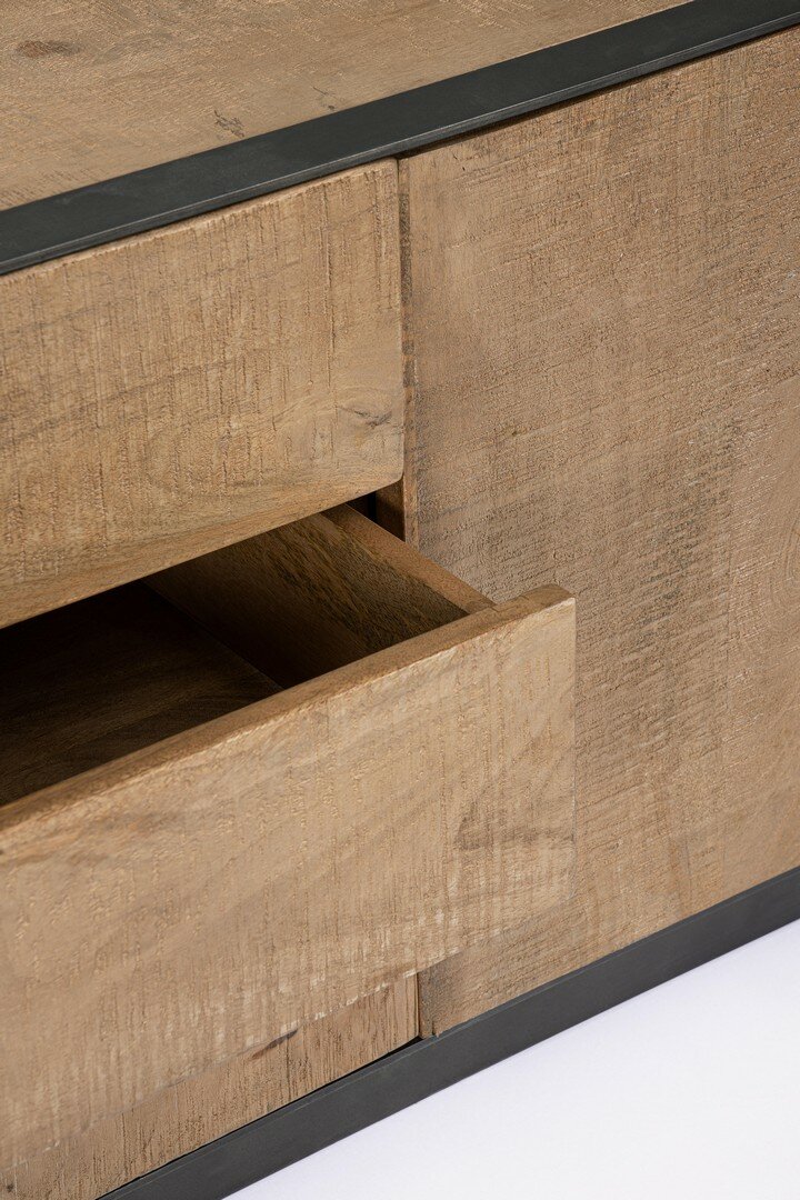 • ESTRUCTURA DE MADERA DE MANGO, ACABADO FINAL CON PINTURA A BASE DE AGUA. PERFIL FRONTAL Y PATAS DE ACERO BARNIZADO CON POLVO EPOXI. PUERTAS Y CAJONES CON BISAGRAS DE CIERRE SUAVE. COMPARTIMENTO PUERTA CON ESTANTE.