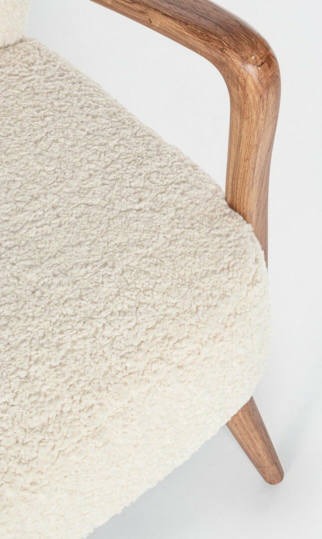 ESTRUCTURA DE MADERA DE PINO Y CONTRACHAPADO. PATAS Y REPOSABRAZOS DE RUBBERWOOD. REVESTIMIENTO DE POLISTÉSTER EFECTO LANA, RELLENO DE ESPUMA DE POLIURETANO DENSIDAD 24KG/M3, NO DESENFUNDABLE. PATAS PARA MONTAR.
