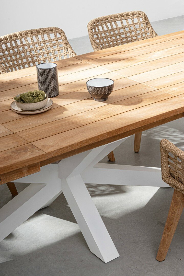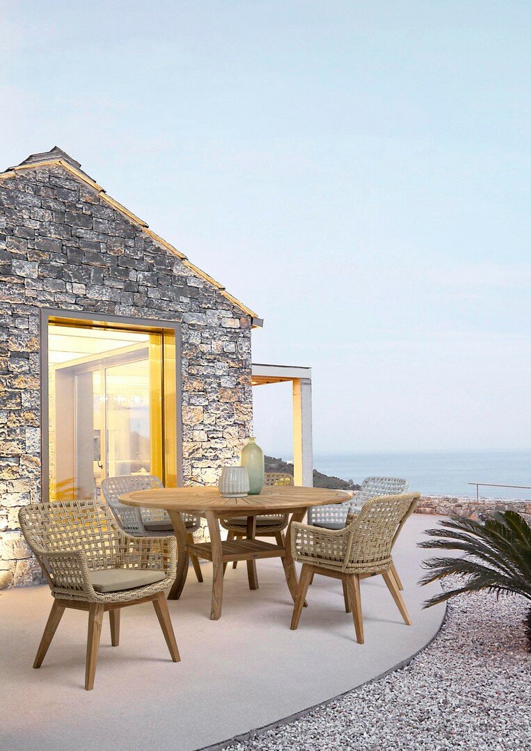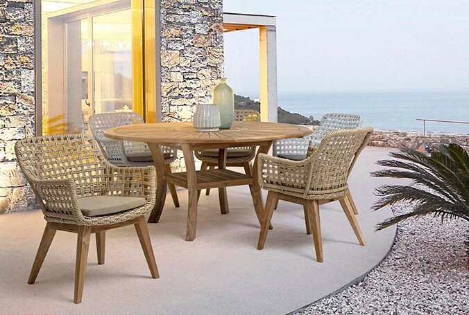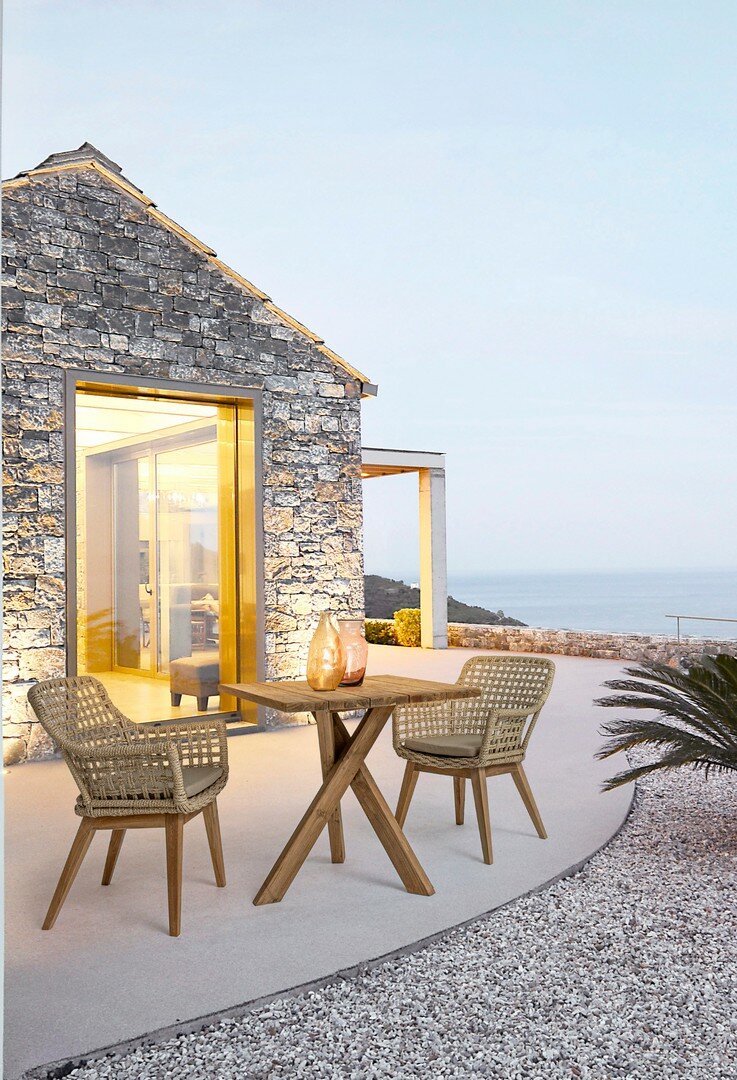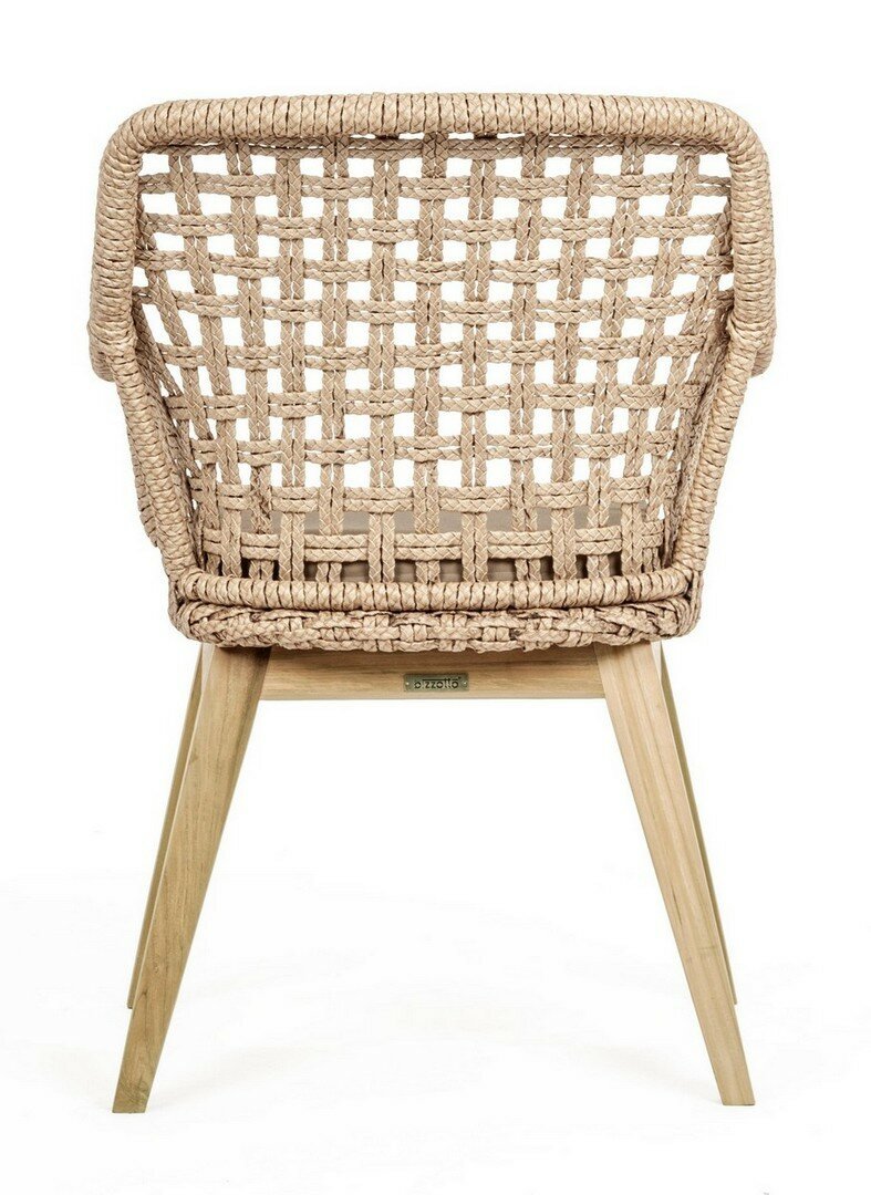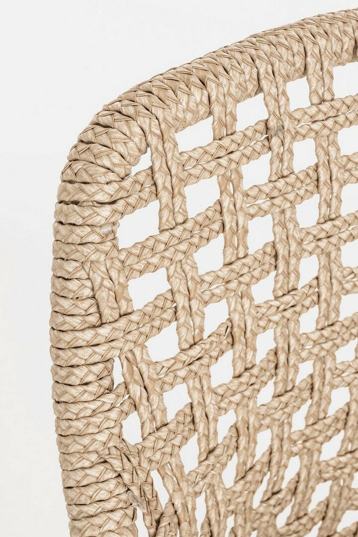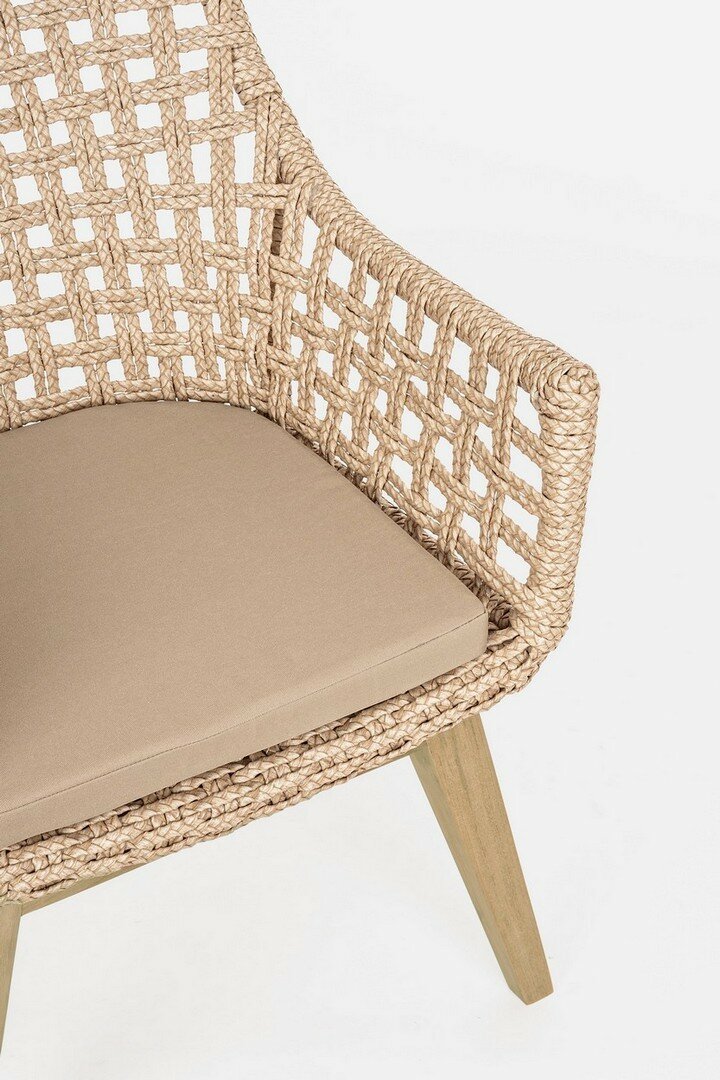 ASIENTO CON ESTRUCTURA DE ALUMINIO BARNIZADO CON POLVO (POLIÉSTER). TRENZADO DE FIBRA SINTÉTICA VIRO CON ORIGINALES PLIEGUES TRENZADOS (EFECTO PIEL). COJÍN ASIENTO DESENFUNDABLE CON TEJIDO REPELENTE AL AGUA SUNPROOF OLEFÍN (100% POLIPROPILENO). PATAS DE TECA-SVLK (MADERA CERTIFICADA PROCEDENTE DE BOSQUES SOSTENIBLES). TORNILLERÍA DE ACERO GALVANIZADO. PATAS PARA MONTAR.