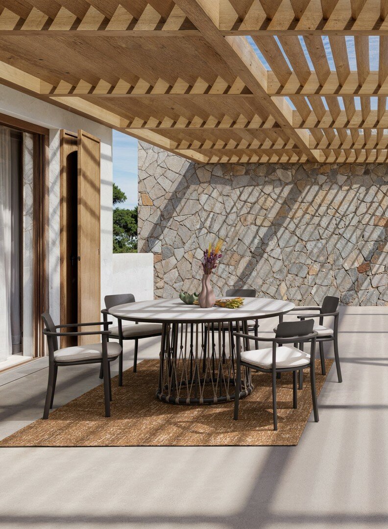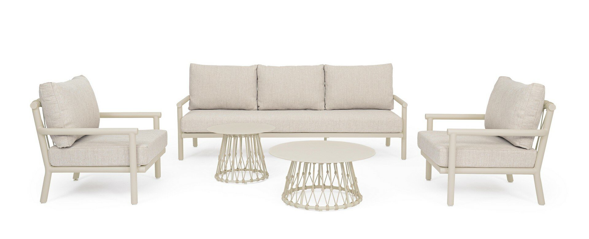ESTRUCTURA DE ALUMINIO BARNIZADO CON POLVO (POLIÉSTER). COJINES DESENFUNDABLES CON TEJIDO REPELENTE AL AGUA OLEFIN (100% POLIPROPILENO) (373 GR/M2). APILABLE.