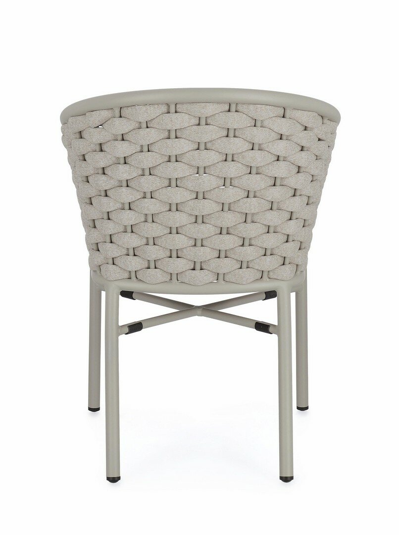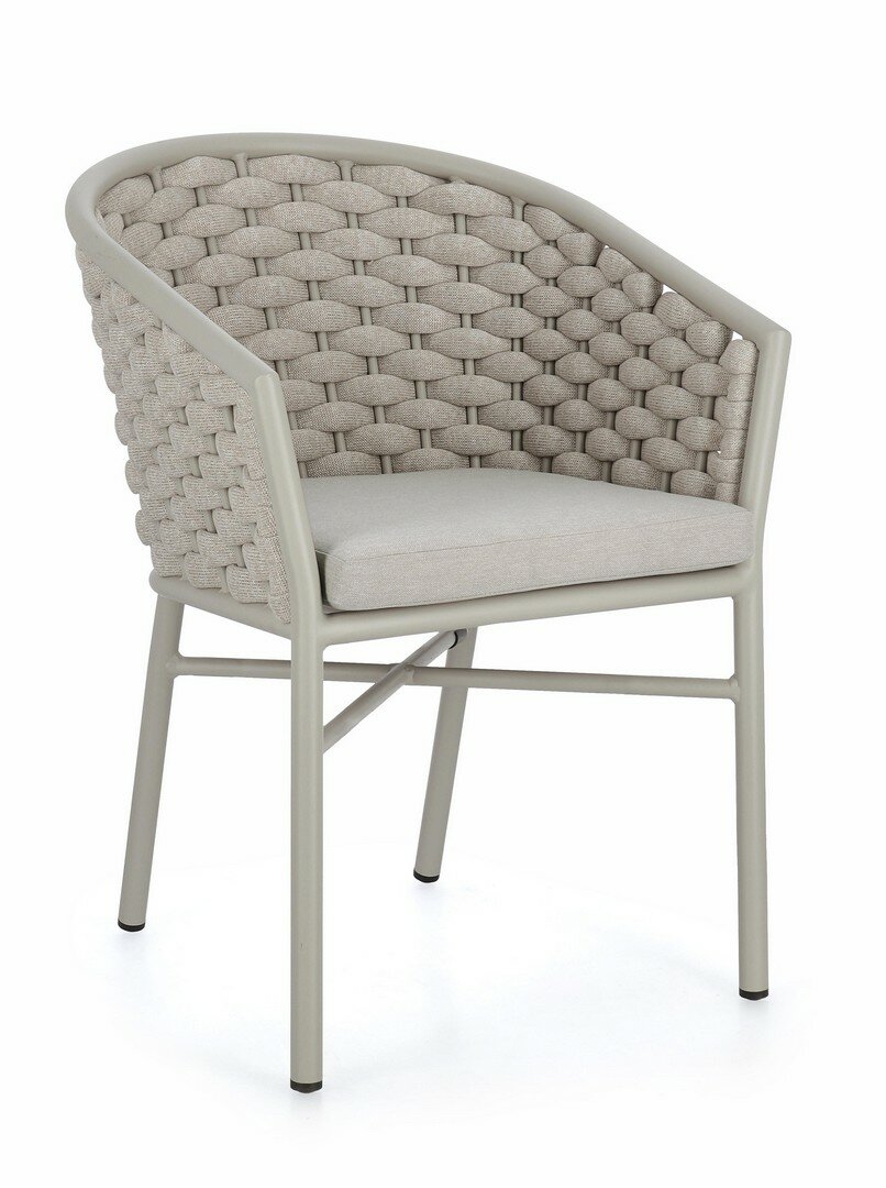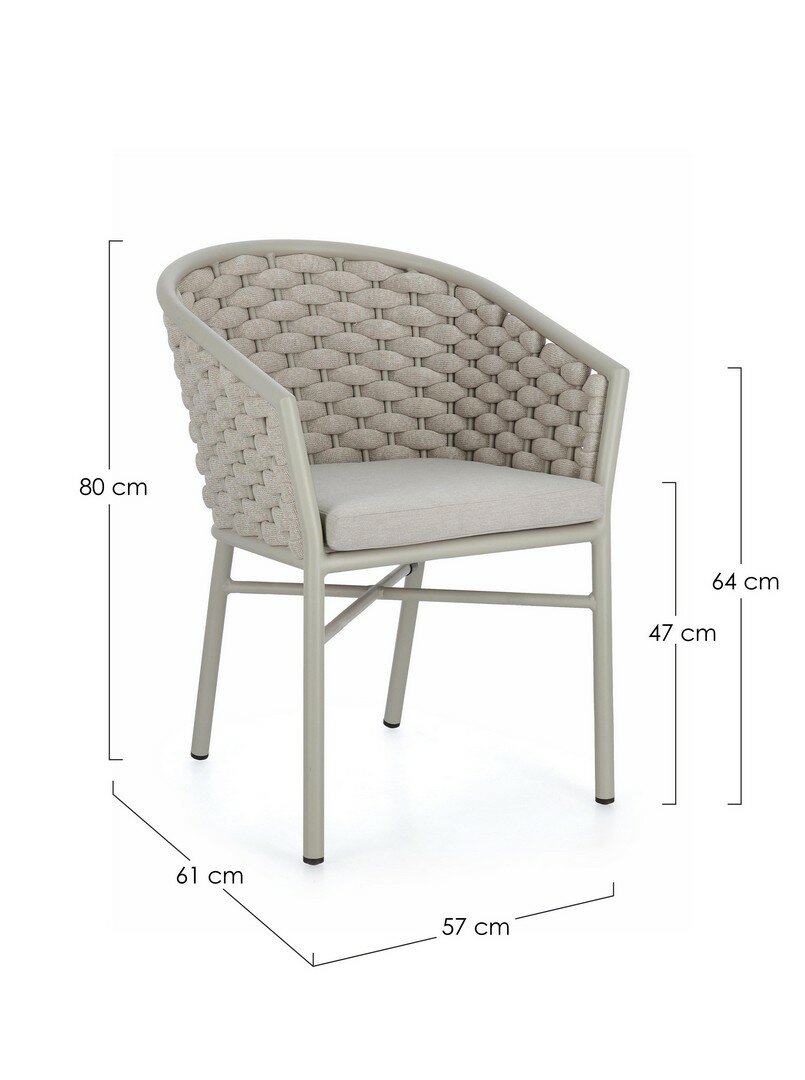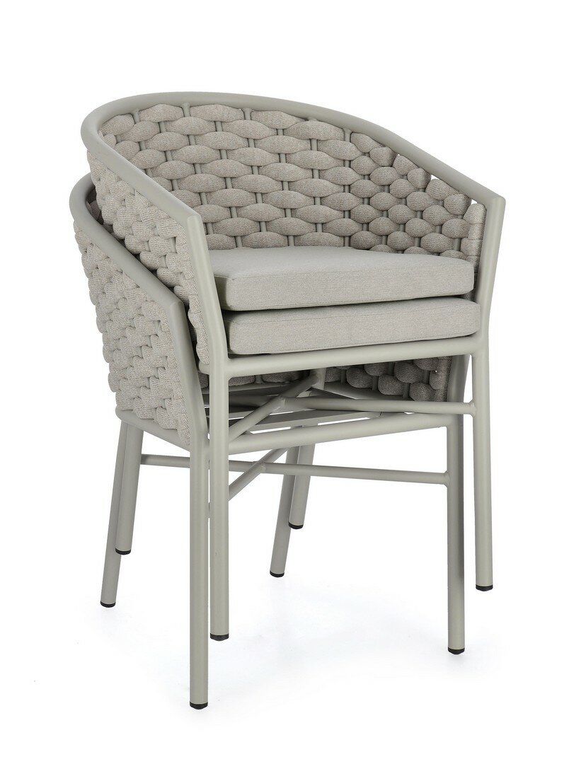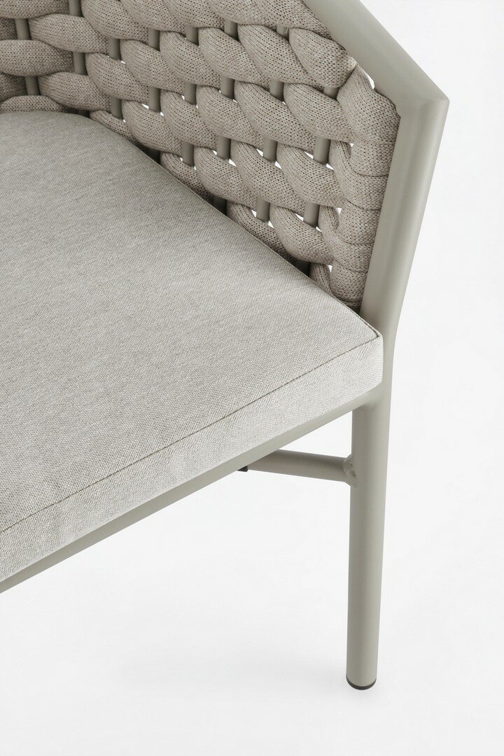 ESTRUCTURA DE ALUMINIO BARNIZADO A POLVO (POLIÉSTER). ENTRAMADO PARA EXTERIOR DE CUERDA DE POLIÉSTER CON RELLENO DE CAUCHO (POLIETILENO). COJINES DESENFUNDABLES CON TEJIDO REPELENTE AL AGUA 100% POLIÉSTER. APILABLE.