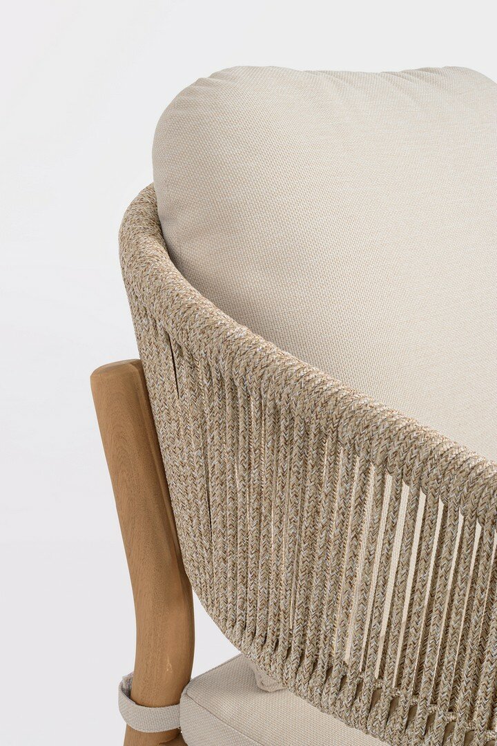 ESTRUCTURA DE MADERA DE ACACIA 100%, ACABADO AL ACEITE (EFECTO TECA). RESPALDO DE ALUMINIO CON TRENZADO DE CUERDA (POLIÉSTER). COJINES DESENFUNDABLES CON TEJIDO REPELENTE AL AGUA OLEFIN (100 % POLIPROPILENO). TORNILLERIA GALVANIZADA. MESAS DE CENTRO CON PATAS REGULABLES PARA MONTAR.
