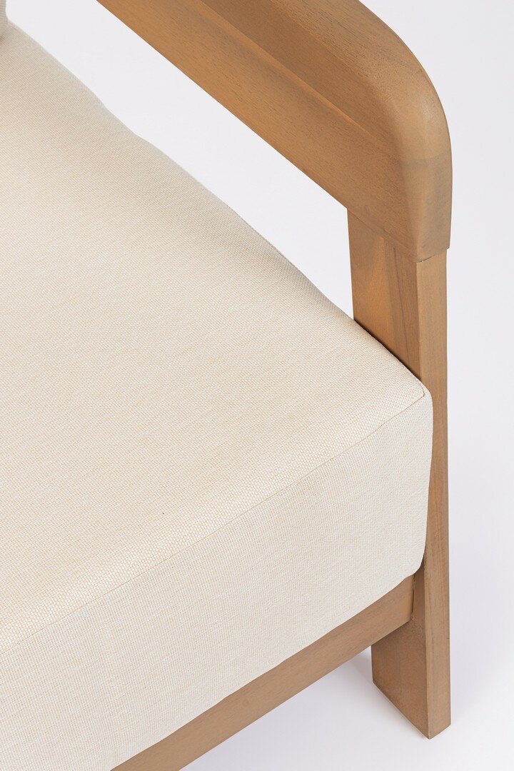 MADERA DE ACACIA 100%, ACABADO AL ACEITE (EFECTO TECA). COJINES DESENFUNDABLES EN TEJIDO REPELENTE AL AGUA OLEFIN (100% POLIPROPILENO).NO ESTÁ A LA VENTA EN ESPAÑA Y POLONIA.