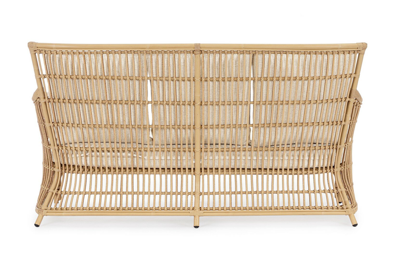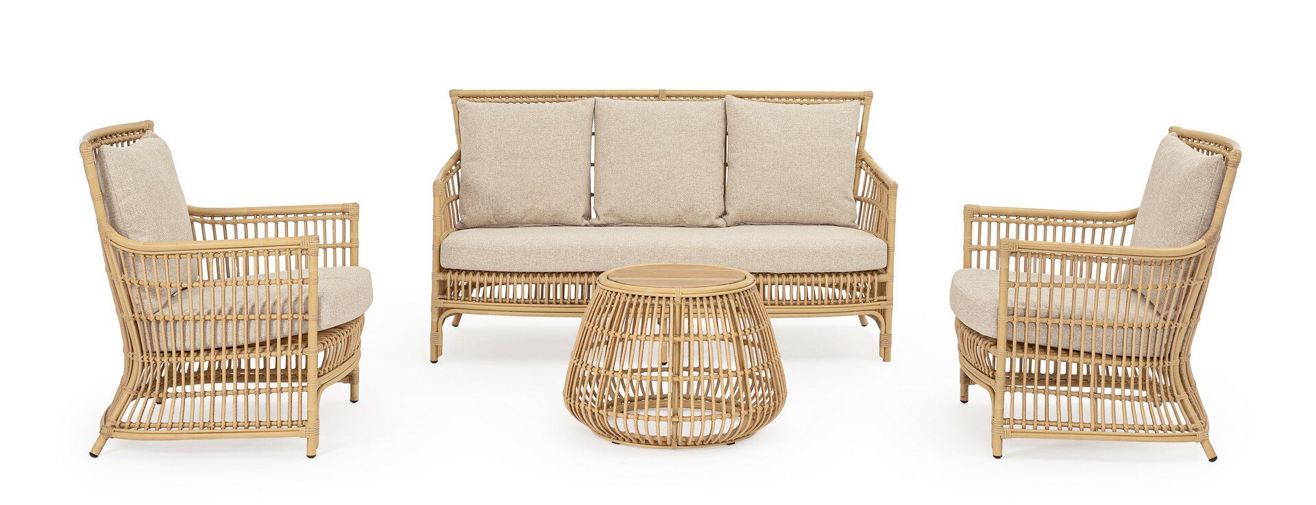 ESTRUCTURA DE ALUMINIO BARNIZADO CON POLVO (POLIÉSTER) CON EFECTO RATÁN, TRENZADO DE FIBRA SINTÉTICA (REDONDO 10MM). COJINES DESENFUNDABLES CON TEJIDO REPELENTE AL AGUA SUNPROOF OLEFIN (100% POLIPROPILENO). EMBALAJE SIN CAJA.