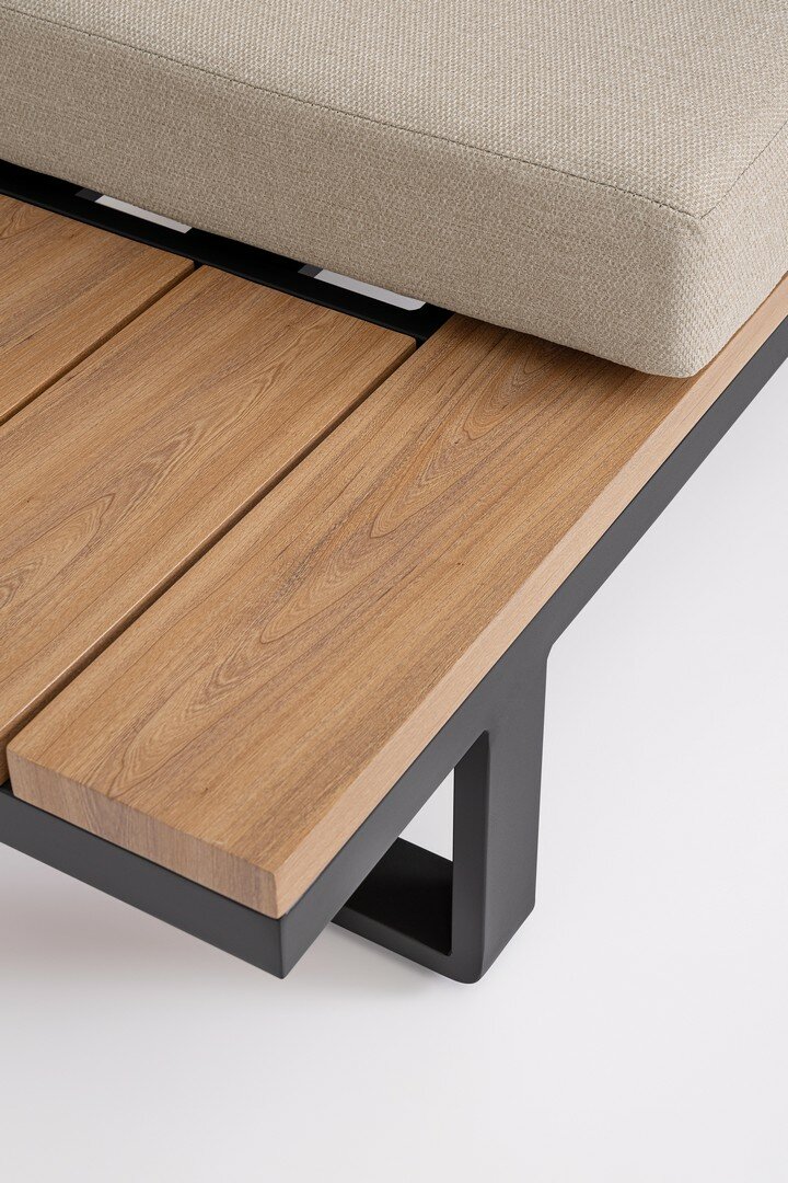 ESTRUCTURA DE ALUMINIO BARNIZADO CON POLVO (POLIESTÉR). LATERALES DEL SOFA’ Y TABLERO DE LA MESA CENTRO DE ALUMINIO BARNIZADO EFECTO MADERA. COJÍN ASIENTO Y RESPALDO DESENFUNDABLES CON TEJIDO REPELENTE AL AGUA OLEFIN (100% POLIPROPILENO). TORNILLERÍA DE ACERO INOXIDABLE. PIES AJUSTABLES. PARA MONTAR.