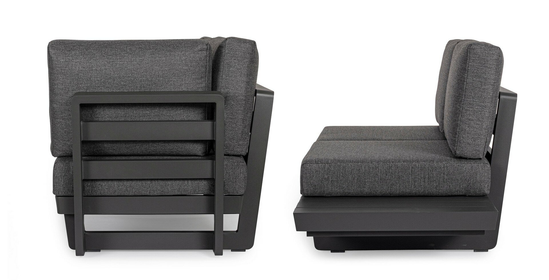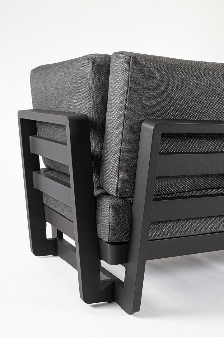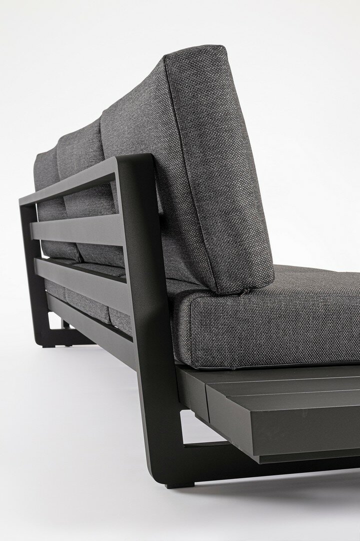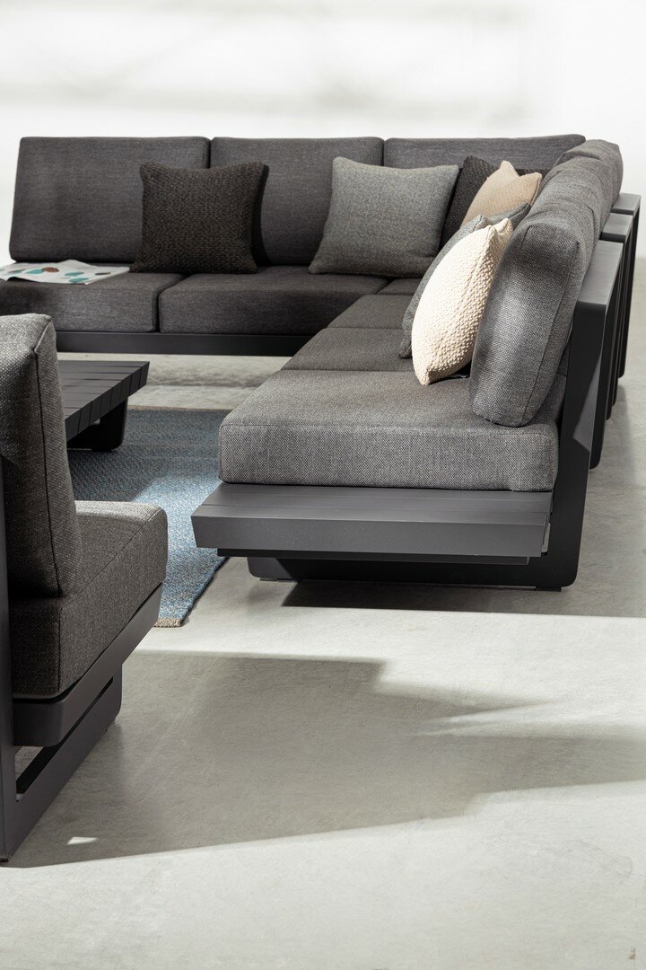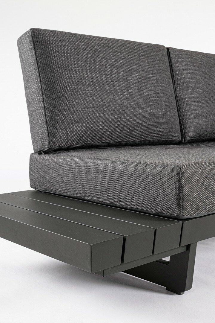 ESTRUCTURA DE ALUMINIO BARNIZADO CON POLVO (POLIESTÉR). COJINES ASIENTO Y RESPALDO DESENFUNDABLES CON TEJIDO REPELENTE AL AGUA OLEFIN (100% POLIPROPILENO). SOFÁS MODULABLES.