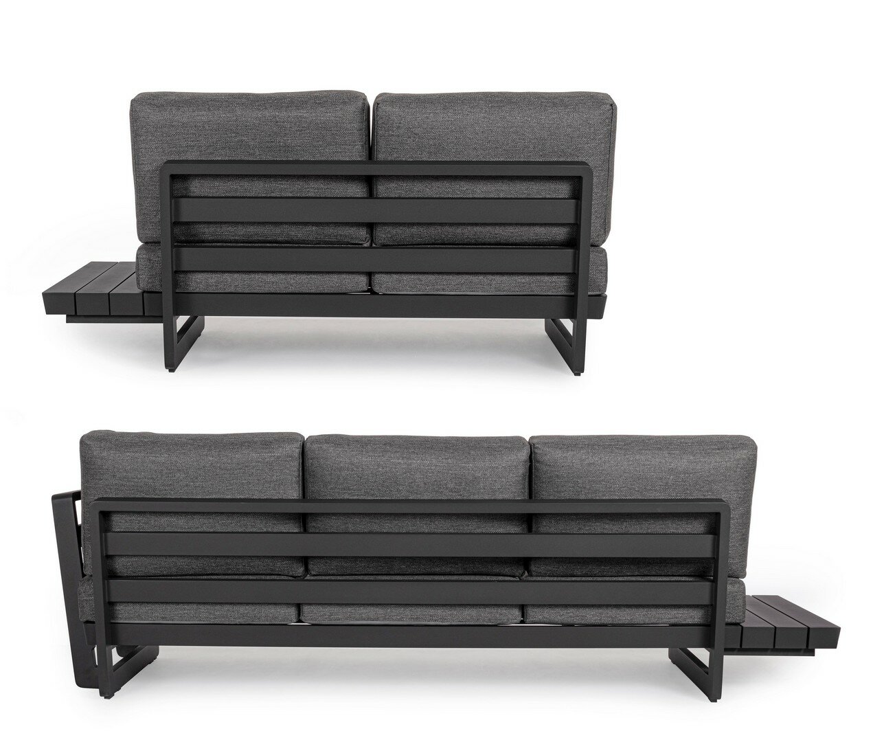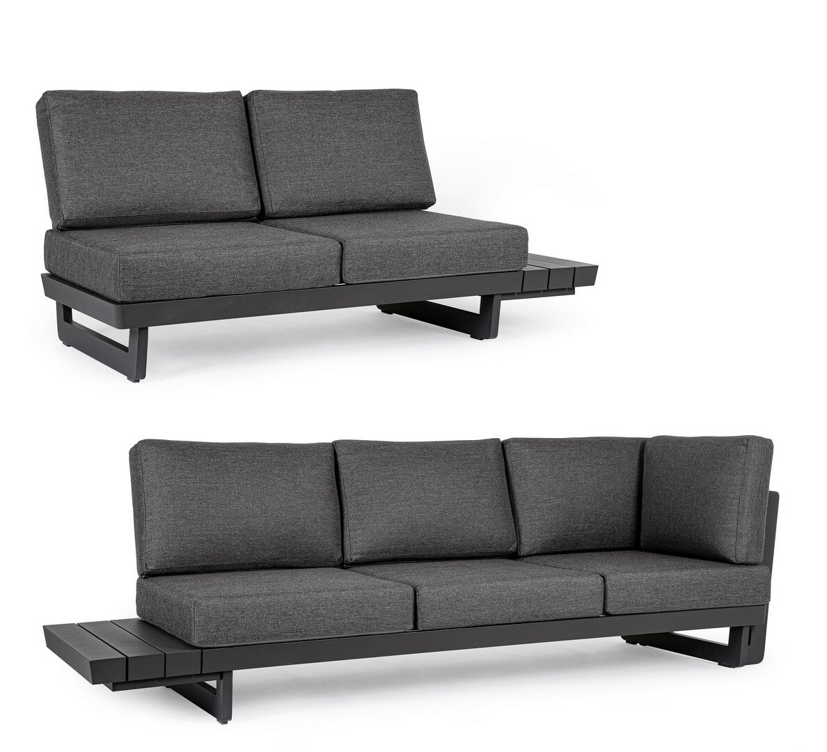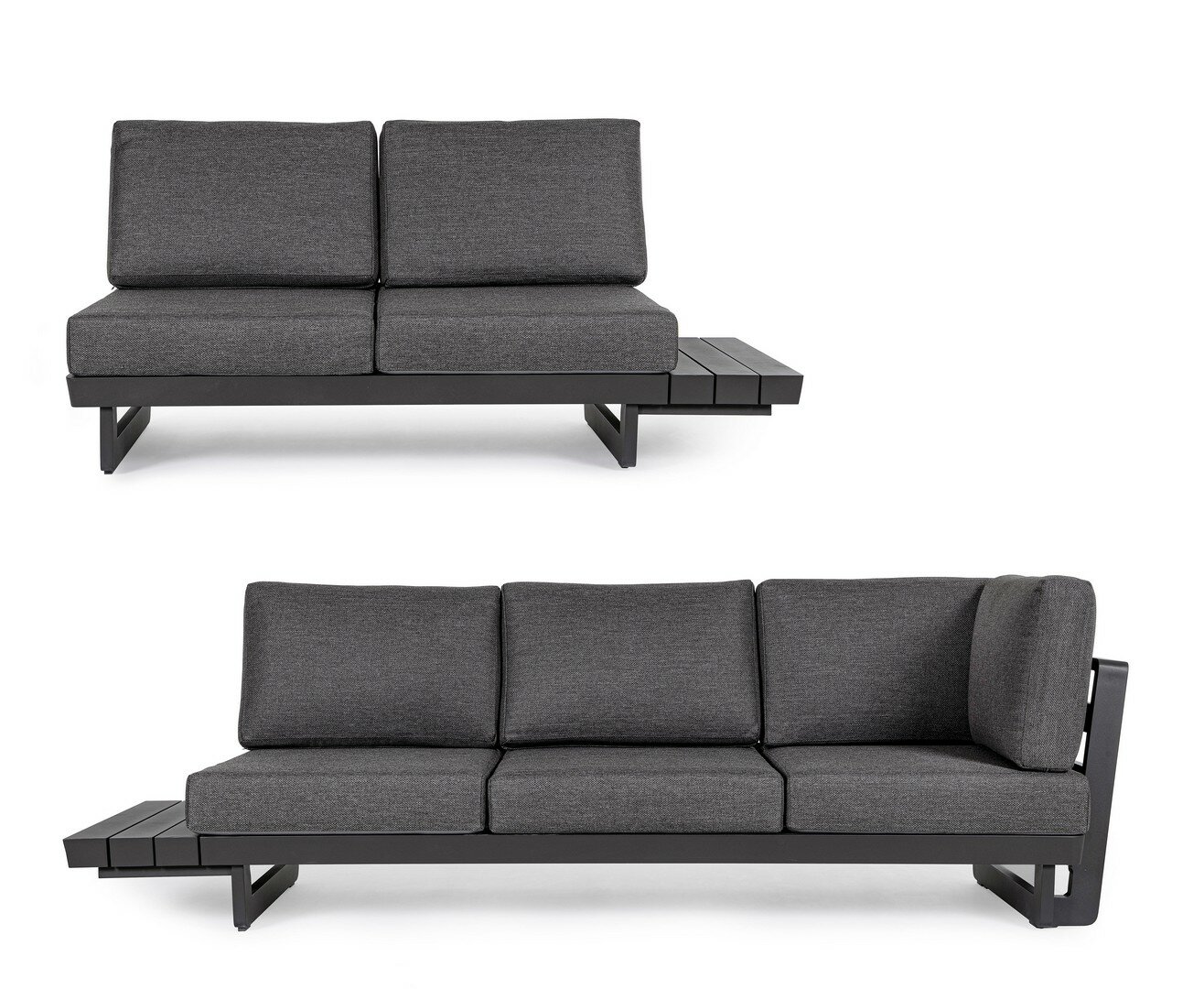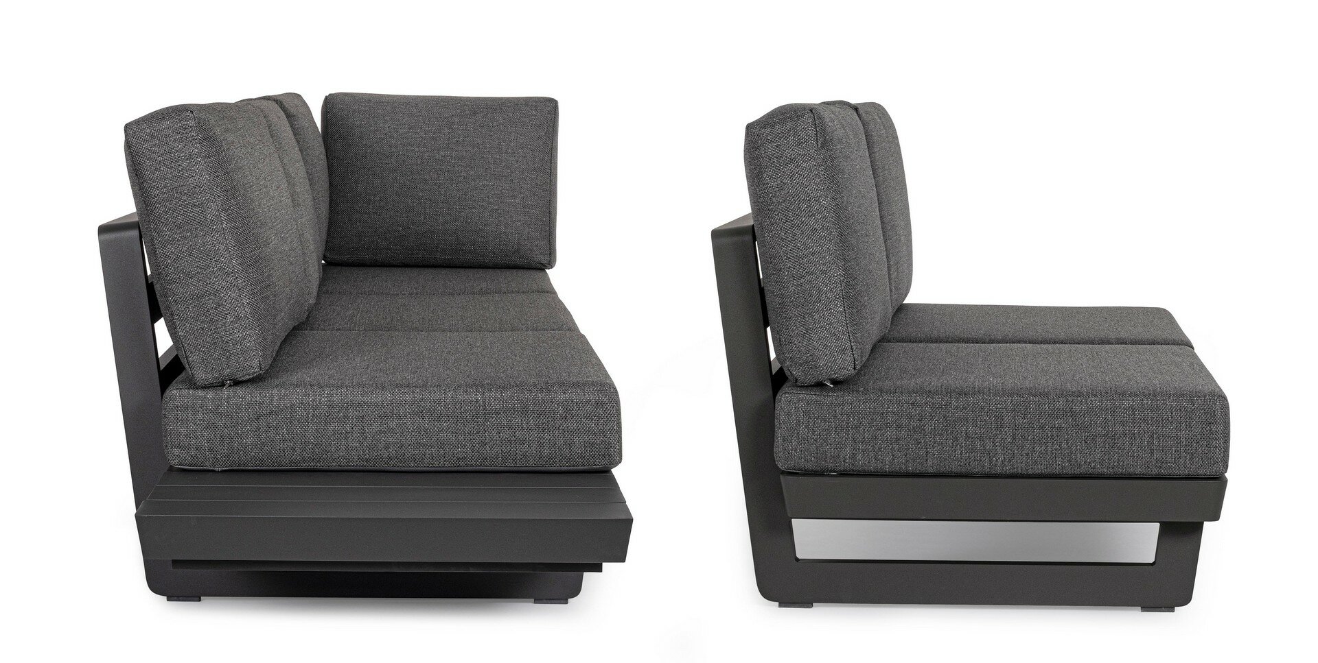 ESTRUCTURA DE ALUMINIO BARNIZADO CON POLVO (POLIESTÉR). COJINES ASIENTO Y RESPALDO DESENFUNDABLES CON TEJIDO REPELENTE AL AGUA OLEFIN (100% POLIPROPILENO). SOFÁS MODULABLES.