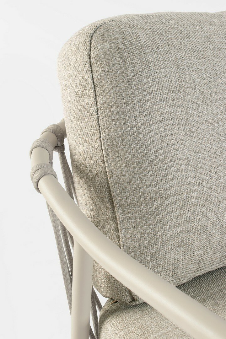 ESTRUCTURA DE ALUMINIO BARNIZADO CON POLVO (POLIÉSTER). RESPALDO CON TRENZADO DE CUERDA OLEFIN. COJINES DESENFUNDABLES CON TEJIDO REPELENTE AL AGUA OLEFIN (100% POLIPROPILENO).