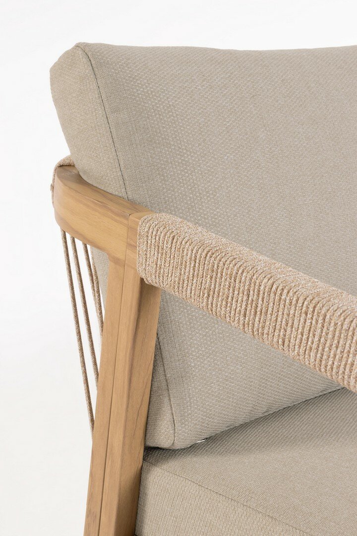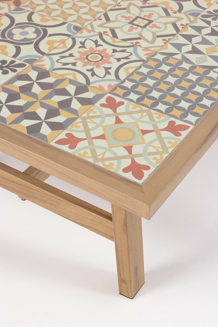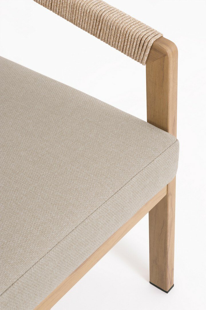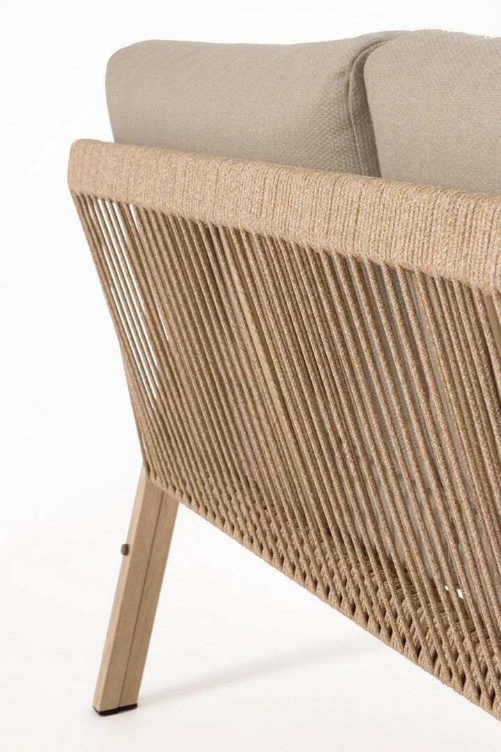 ALUMINIO BARNIZADO CON POLVO (POLIÉSTER) EFECTO MADERA. TABLERO CON AZULEJOS DE PORCELANA ESMALTADA (ORIGEN ESPAÑA). RESPALDO Y REPOSABRAZOS CON TRENZADO DE CUERDA DE POLIÉSTER (REDONDA 5MM). COJINES ASIENTO Y RESPALDO DESENFUNDABLES CON TEJIDO REPELENTE AL AGUA OLEFIN (100% POLIPROPILENO) . TORNILLERÍA DE ACERO INOXIDABLE. PARA MONTAR.