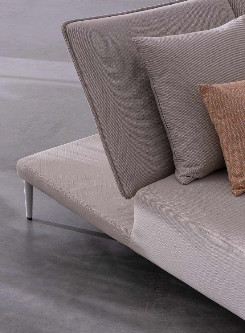 STRUCTURE EN ALUMINIUM. ASSISE ET DOSSIER (INCLINABLE EN POSITION LIBRE) NON DÉHOUSSABLES AVEC TISSU POUR EXTÉRIEUR OLEFIN (100% POLYPROPYLÈNE, 285GR/M2), HYDROFUGE ET RÉSISTANT AUX UV (GRADE 7), IMPERMÉABILISÉ INTÉRIEUREMENT AVEC REVÊTEMENT EN TISSU (GRADE 7). REMBOURRAGE EN MOUSSE POLYURÉTHANE, DENSITE’ 40KG/M3. INCLUS DE ROULEMENT DÉHOUSSABLE. PIEDS RÉGLABLES À ASSEMBLER.