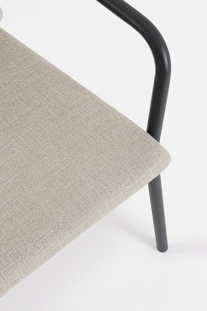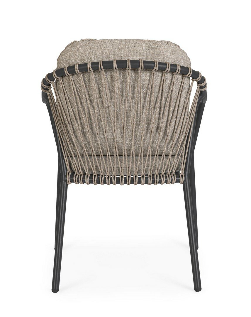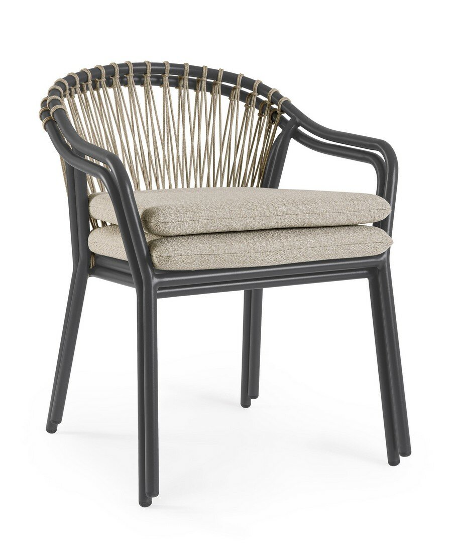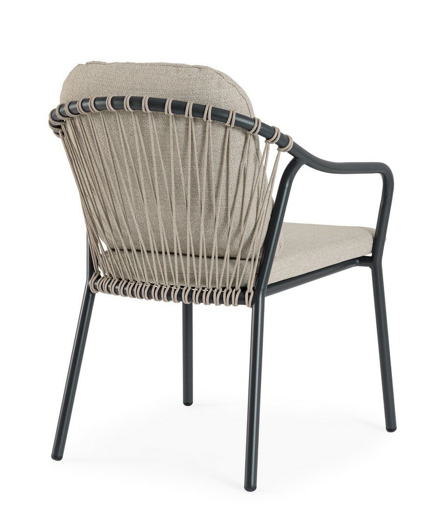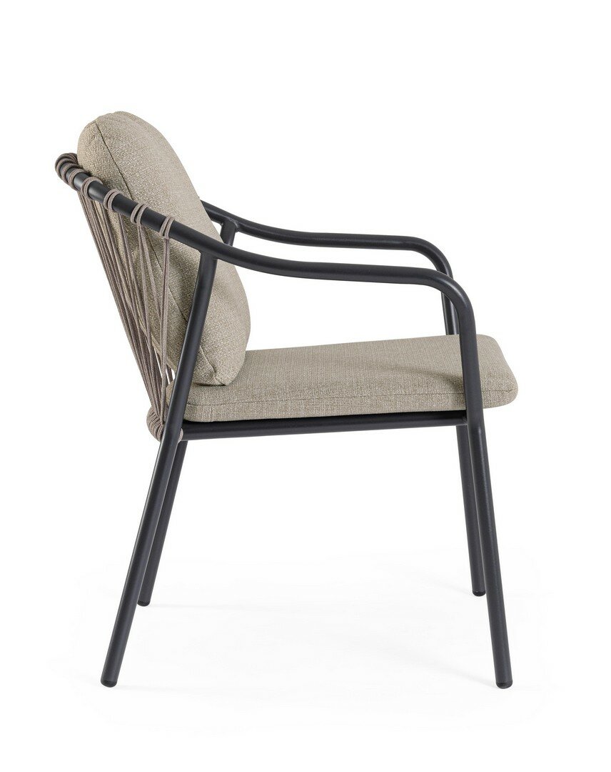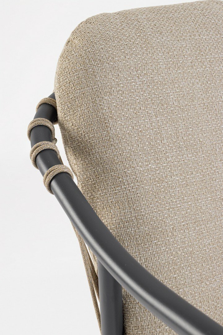 STRUCTURE EN ALUMINIUM PEINT À POUDRE (POLYESTER). DOSSIER (AVEC TRESSAGE EN CORDE D’OLÉFIN). COUSSINS DÉHOUSSABLES AVEC TISSU HYDROFUGE OLEFIN (100% POLYPROPYLÈNE). EMPILABLE.