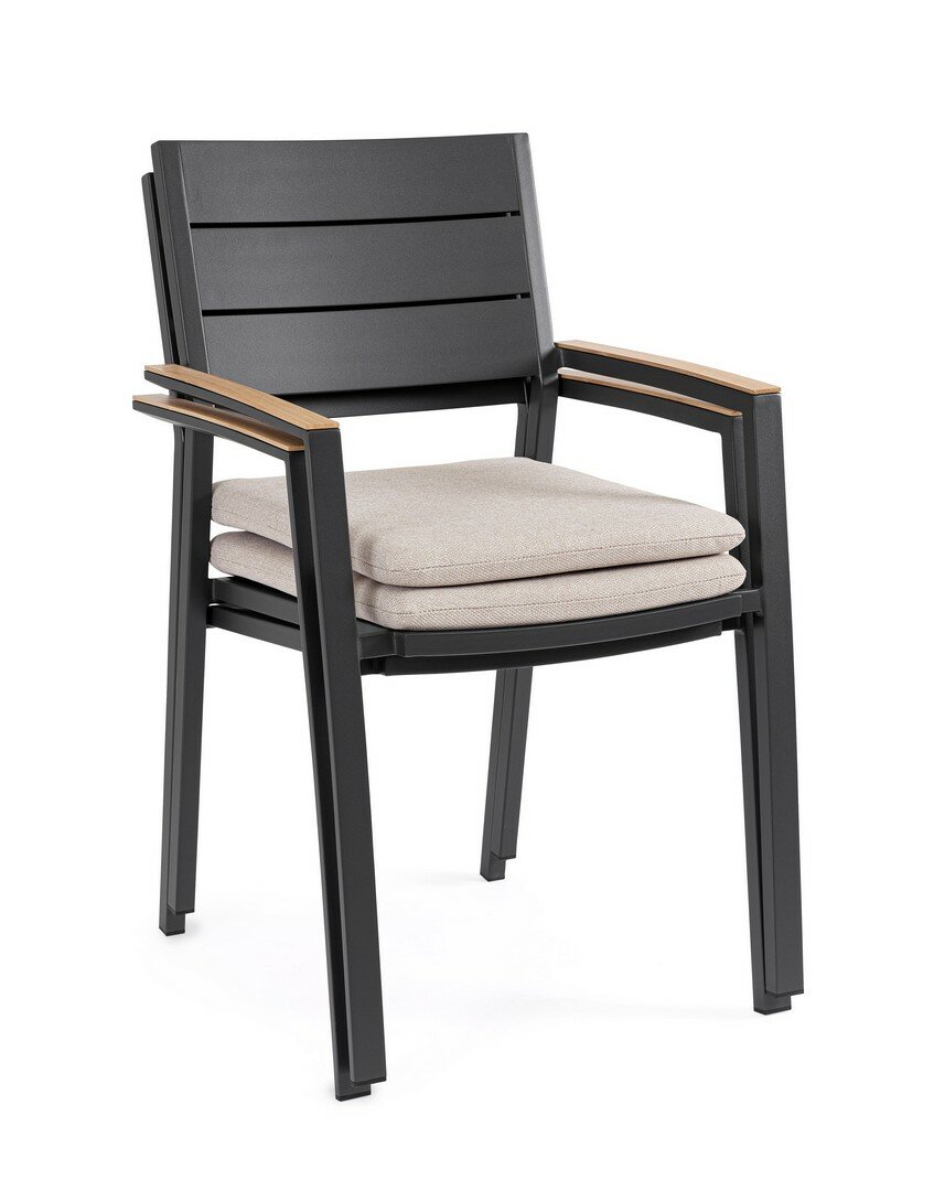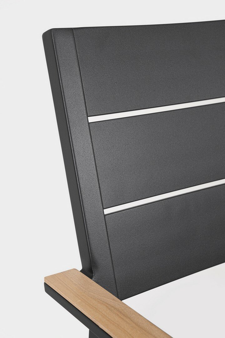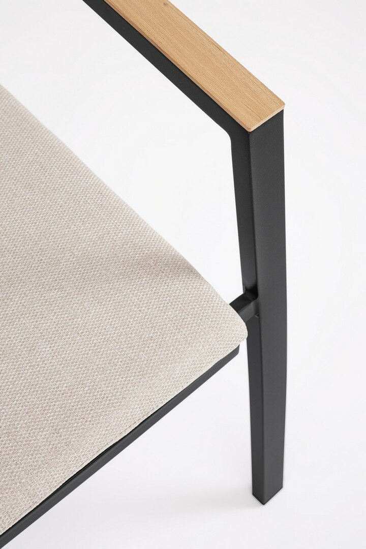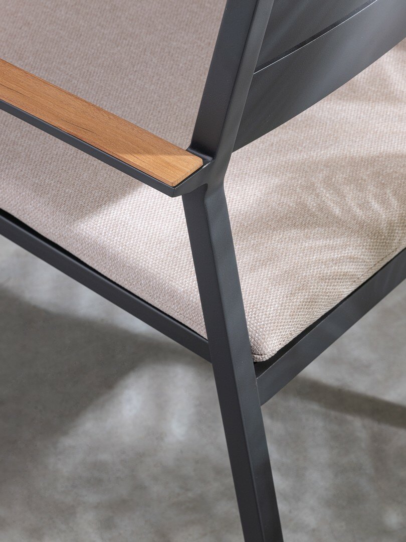 STRUCTURE EN ALUMINIUM PEINT À POUDRE (POLYESTER). ACCOUDOIRS EN ALUMINIUM AVEC PEINTURE EFFET BOIS. COUSSIN ASSISE DÉHOUSSABLE AVEC TISSU HYDROFUGE OLEFIN (100% POLYPROPYLÈNE). EMPILABLE.