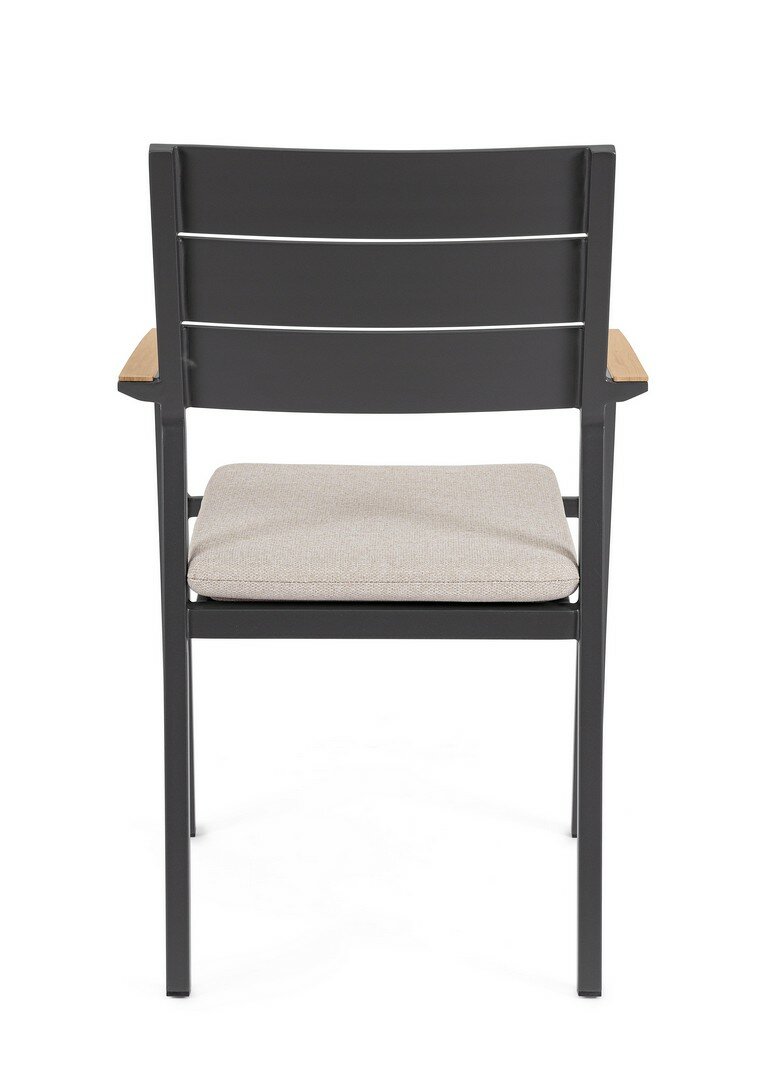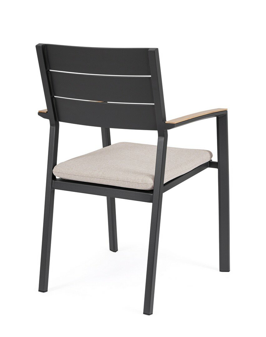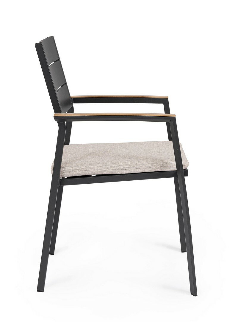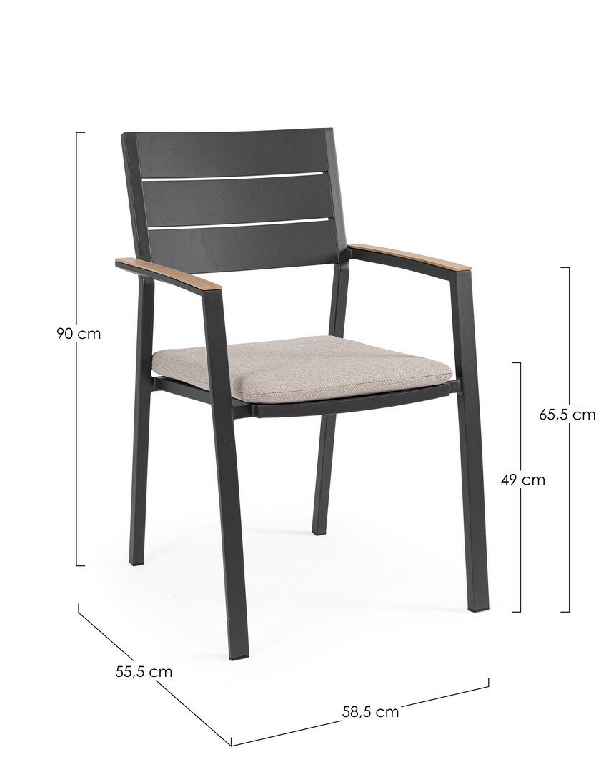 STRUCTURE EN ALUMINIUM PEINT À POUDRE (POLYESTER). ACCOUDOIRS EN ALUMINIUM AVEC PEINTURE EFFET BOIS. COUSSIN ASSISE DÉHOUSSABLE AVEC TISSU HYDROFUGE OLEFIN (100% POLYPROPYLÈNE). EMPILABLE.