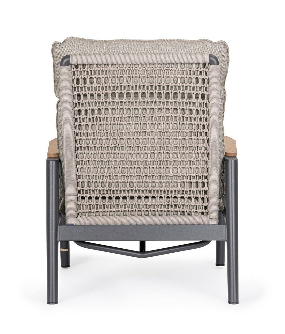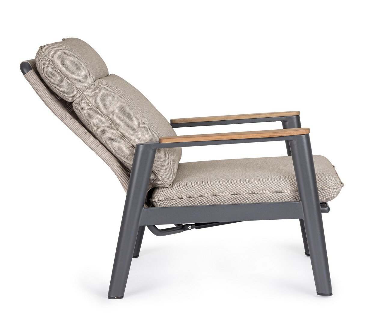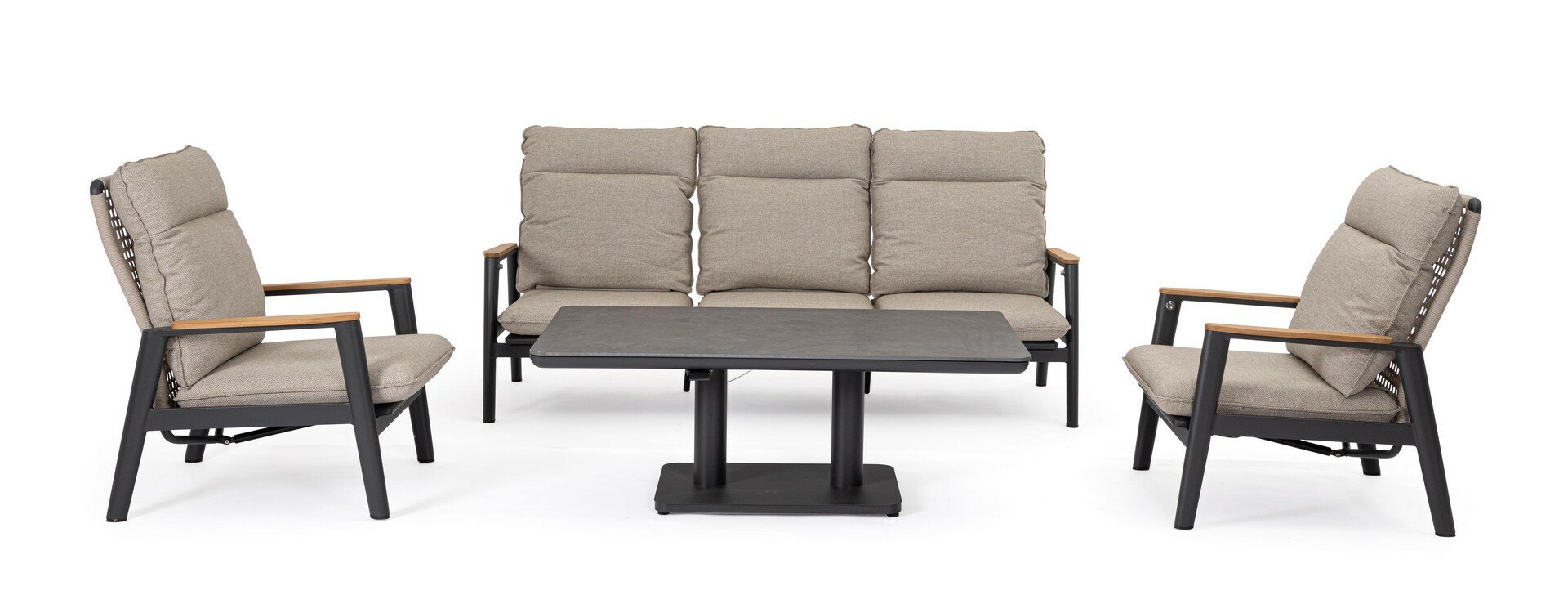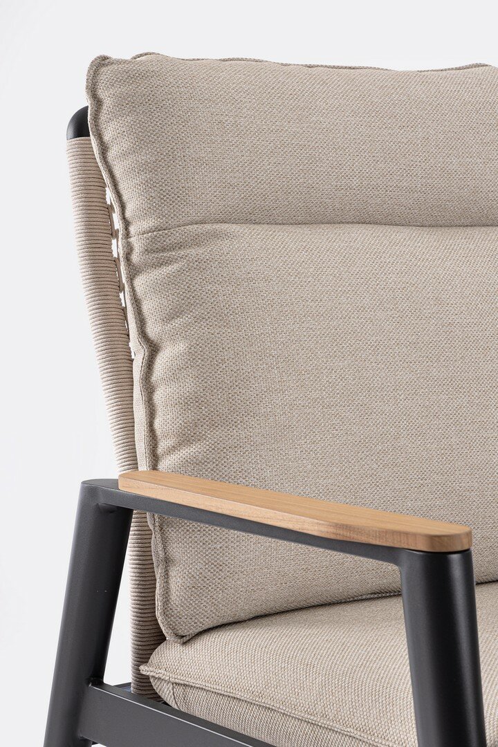 STRUCTURE EN ALUMINIUM PEINT À POUDRE (POLYESTER). ACCOUDOIRS AVEC INSERTS EN TECK. DOSSIERS (AVEC TRESSAGE EN CORDE OLEFIN) INCLINABLES EN POSITION LIBRE ET SIÈGES EN TEXTILENE 1X1. COUSSINS DÉHOUSSABLES AVEC TISSU HYDROFUGE OLEFIN (100% POLYPROPYLÈNE). VIS EN ACIER INOXYDABLE. DOSSIER À INSÉRER.PAS A VENDRE EN ALLEMAGNE, AUTRICHE, SUISSE, PAYS-BAS ET LUXEMBOURG.