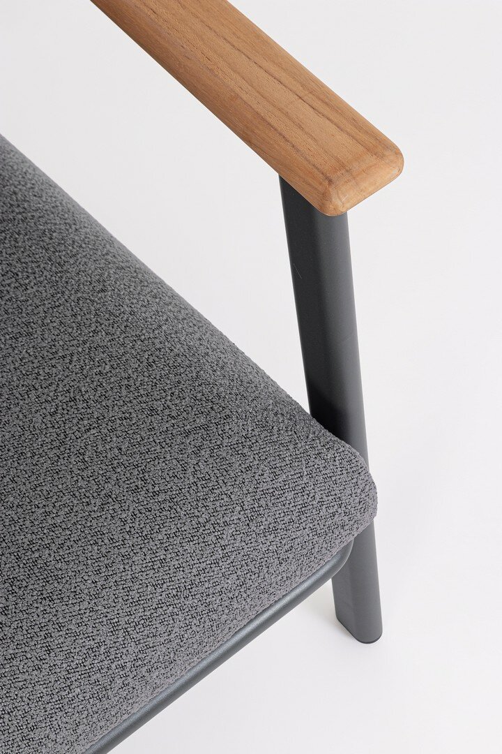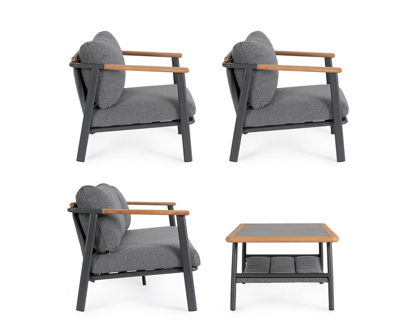 STRUCTURE EN ALUMINIUM PEINT À POUDRE (POLYESTER). DOSSIER ET ÉTAGÈRE TABLE BASSE EN TISSU HYDROFUGE OLEFIN (100% POLYPROPYLÈNE), EFFET BOUCLÉ. ACCOUDOIRS ET DOSSIERS AVEC INSERT EN TECK. COUSSINS DÉHOUSSABLES EN TISSU HYDROFUGE OLEFIN (100% POLYPROPYLÈNE), EFFET BOUCLE’. TABLE BASSE (PIEDS À ASSEMBLER) AVEC PLATEAU EN VERRE IMPRIMÉ, EFFET 3D.