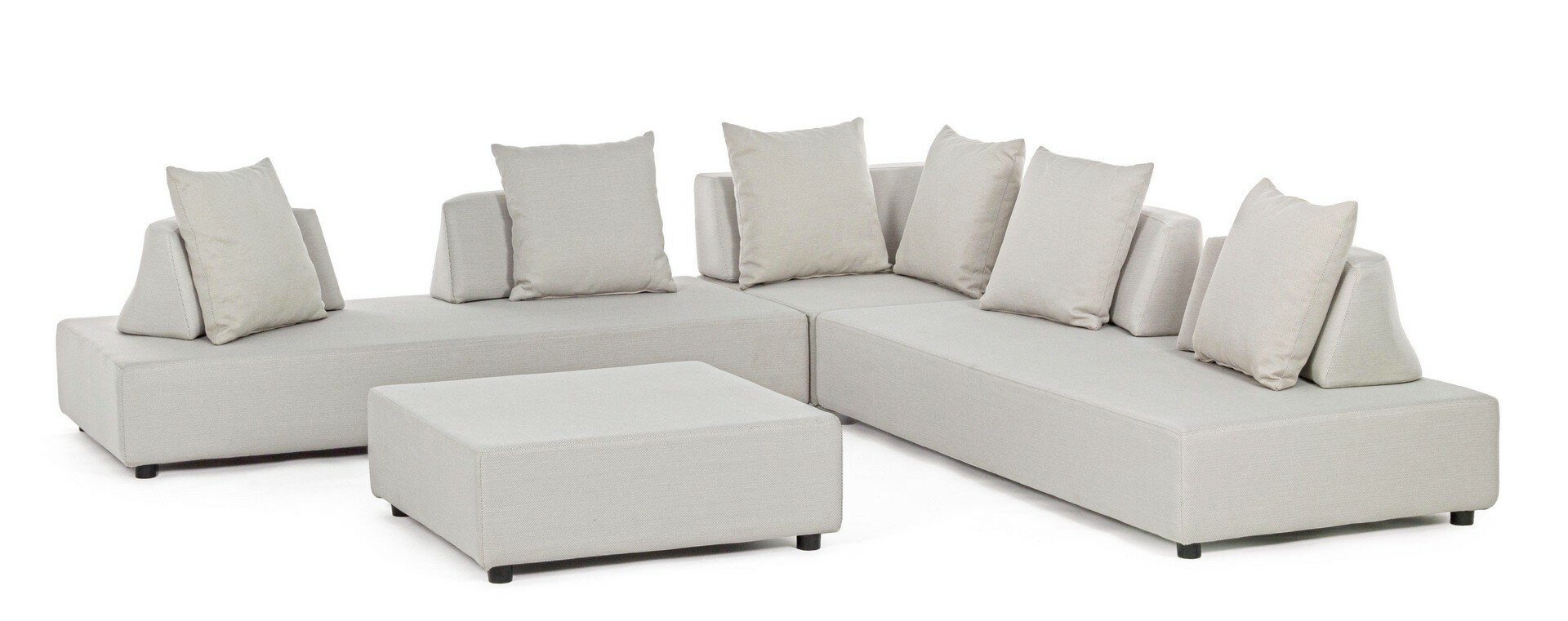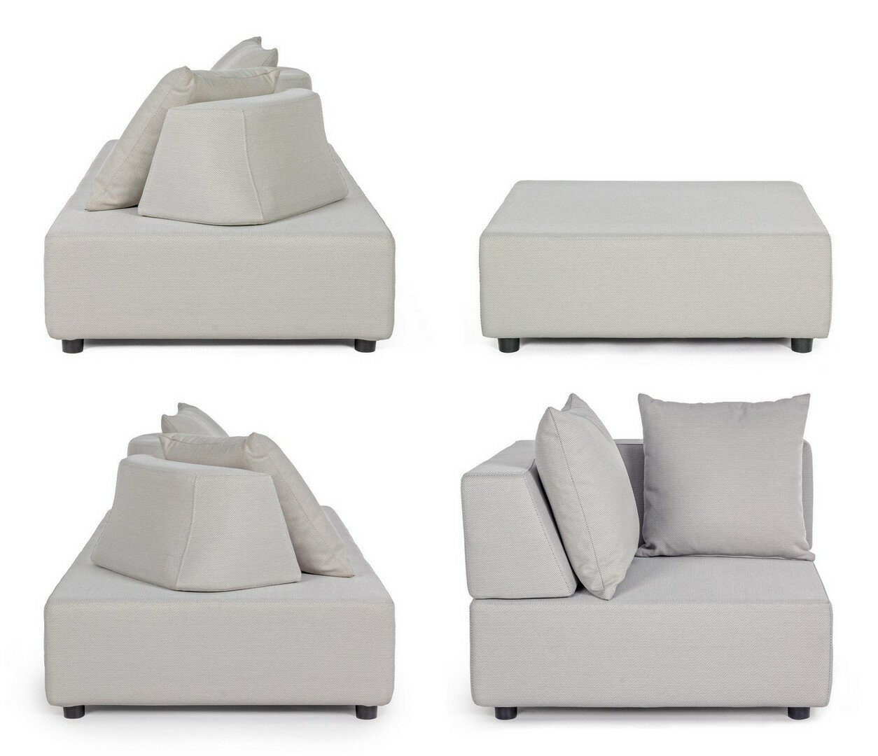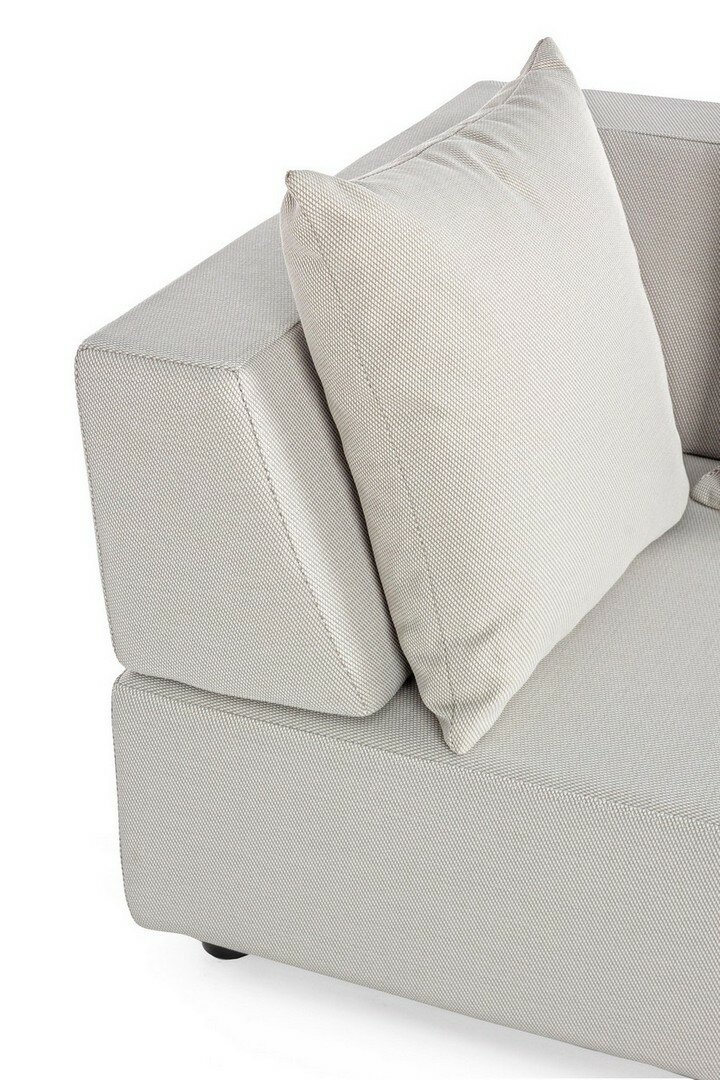 CANAPÉS ET OTTOMAN AVEC STRUCTURE EN ALUMINIUM. DOSSIERS AMOVIBLES AVEC STRUCTURE EN ACIER, GALVANISÉE À LA CHAUD ET PEINT À POUDRE (POLYESTER). ASSISES, DOSSIERS ET COUSSINS DÉHOUSSABLES AVEC TISSU POUR L’EXTÉRIEUR OLEFIN (100% POLYPROPYLÈNE, 285 GR/M2), HYDROFUGE ET RÉSISTANT AUX RAYONS UV (DEGRÉ 7), IMPERMÉABILISÉ À L’INTÉRIEUR AVEC UN REVÊTEMENT EN TISSU (POLYURÉTHANE). REMBOURRAGE EN MOUSSE POLYURÉTHANE DENSITÉ ASSISE (38KG/M3), DOSSIER (20KG/M3). ARTICLE COMPOSÉ PAR: N°2 CANAPÉS, N°1 CANAPÉ D’ANGLE, N°1 OTTOMAN, N°4 DOSSIERS DEMI-LUNE, N°1 DOSSIER À L, N°6 COUSSINS. CANAPÉ D’ANGLE: 90a – 90b – 32h: CANAPÉ: 200a – 90b – 32h: OTTOMAN: 90a – 90b – 32h: DOSSIER DEMI-LUNE: 69a – 36b – 32h: DOSSIER D’ANGLE: 90a – 90b – 32h