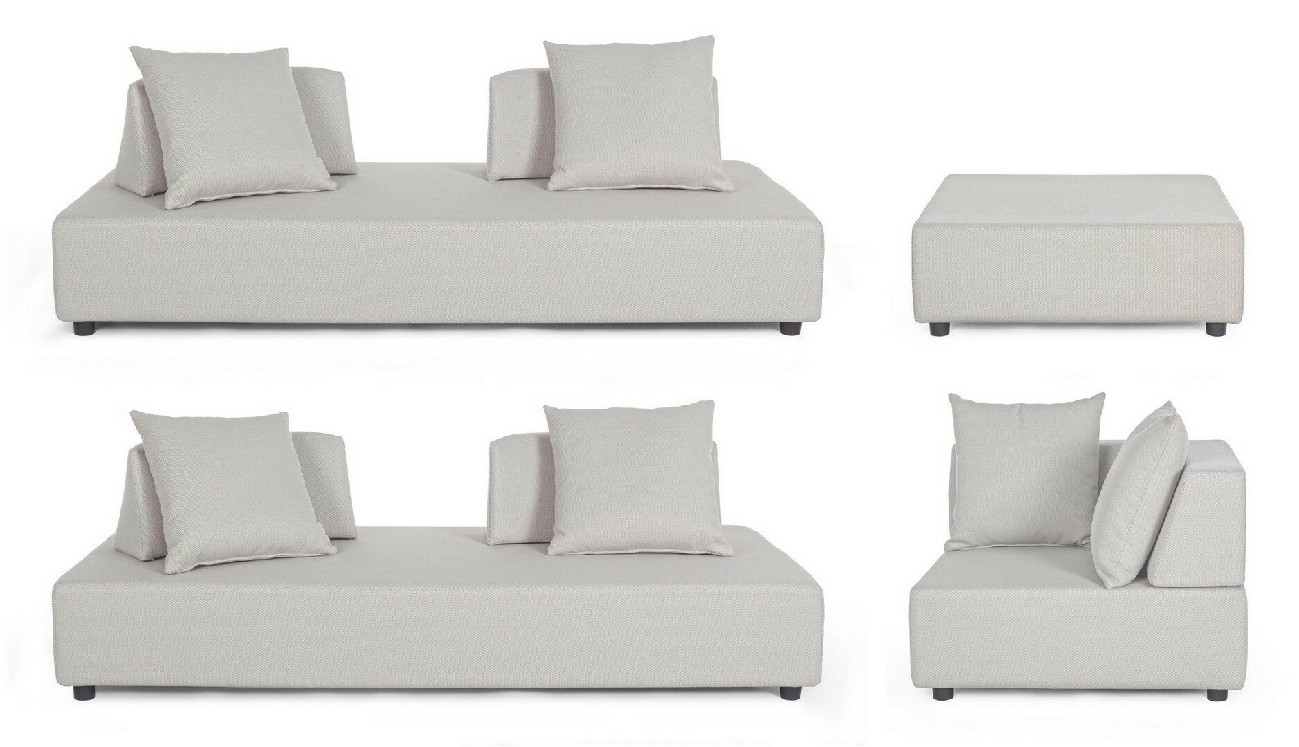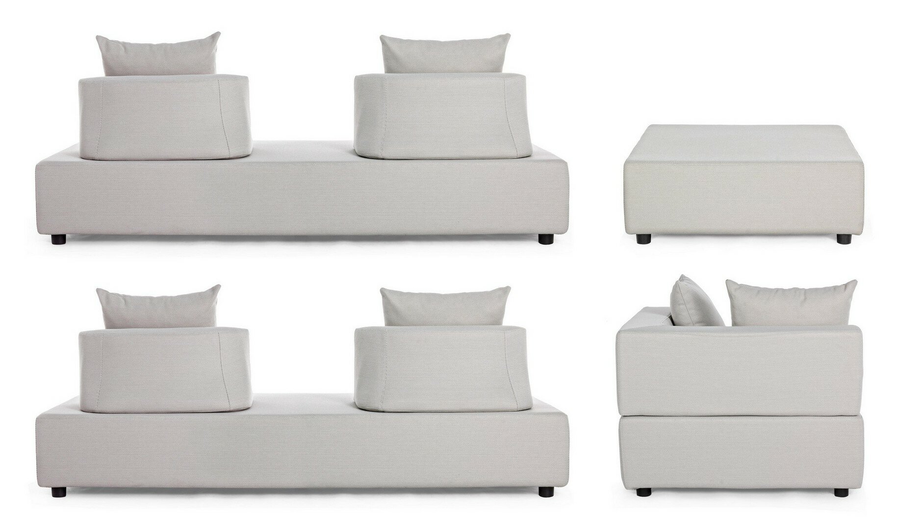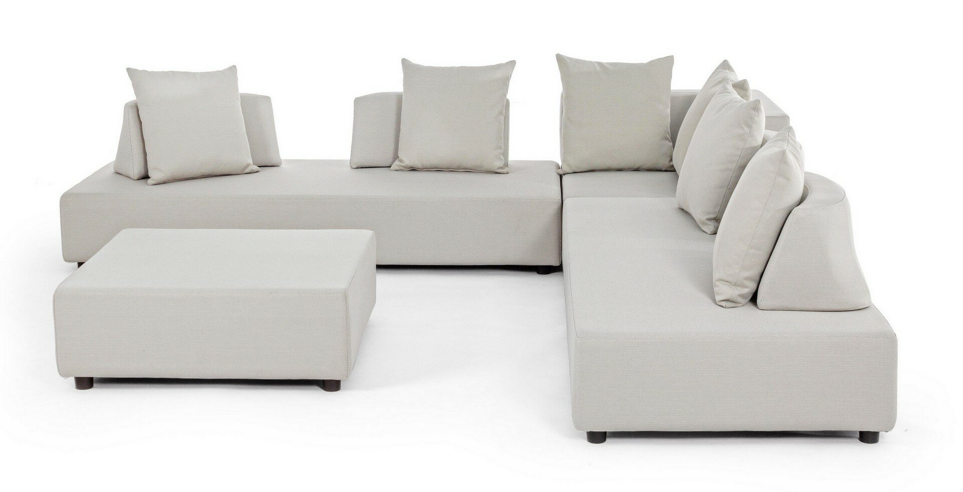 CANAPÉS ET OTTOMAN AVEC STRUCTURE EN ALUMINIUM. DOSSIERS AMOVIBLES AVEC STRUCTURE EN ACIER, GALVANISÉE À LA CHAUD ET PEINT À POUDRE (POLYESTER). ASSISES, DOSSIERS ET COUSSINS DÉHOUSSABLES AVEC TISSU POUR L’EXTÉRIEUR OLEFIN (100% POLYPROPYLÈNE, 285 GR/M2), HYDROFUGE ET RÉSISTANT AUX RAYONS UV (DEGRÉ 7), IMPERMÉABILISÉ À L’INTÉRIEUR AVEC UN REVÊTEMENT EN TISSU (POLYURÉTHANE). REMBOURRAGE EN MOUSSE POLYURÉTHANE DENSITÉ ASSISE (38KG/M3), DOSSIER (20KG/M3). ARTICLE COMPOSÉ PAR: N°2 CANAPÉS, N°1 CANAPÉ D’ANGLE, N°1 OTTOMAN, N°4 DOSSIERS DEMI-LUNE, N°1 DOSSIER À L, N°6 COUSSINS. CANAPÉ D’ANGLE: 90a – 90b – 32h: CANAPÉ: 200a – 90b – 32h: OTTOMAN: 90a – 90b – 32h: DOSSIER DEMI-LUNE: 69a – 36b – 32h: DOSSIER D’ANGLE: 90a – 90b – 32h