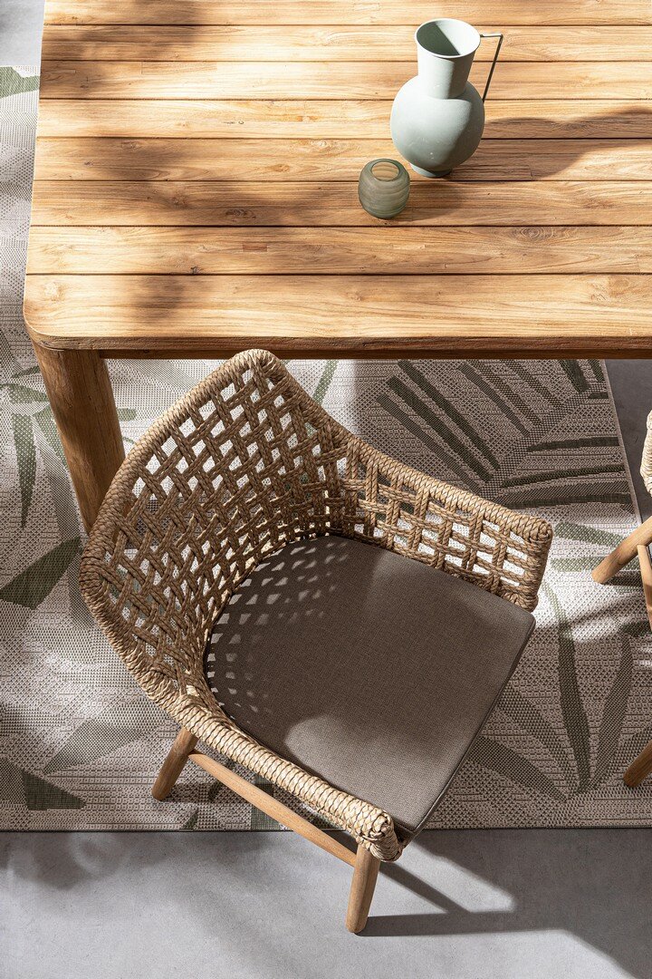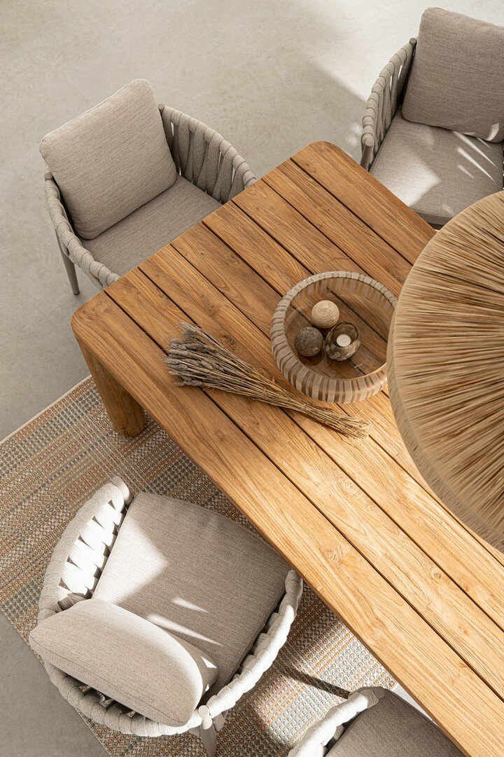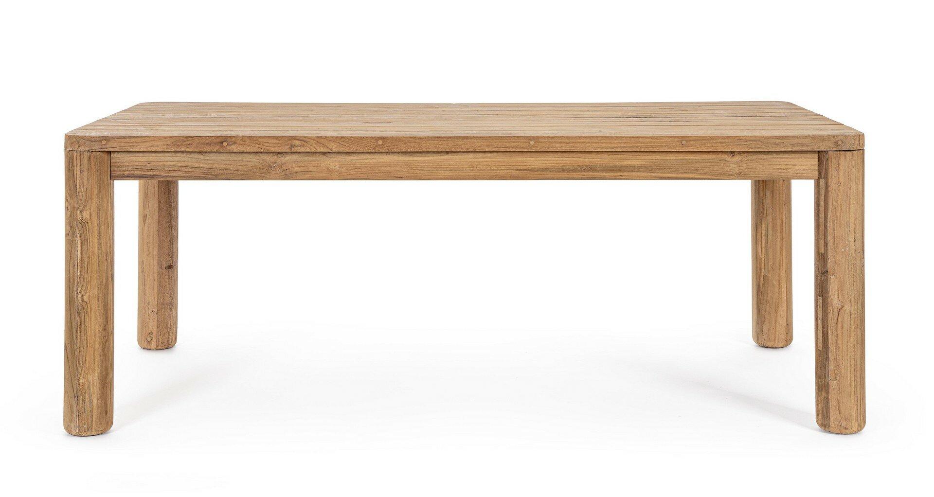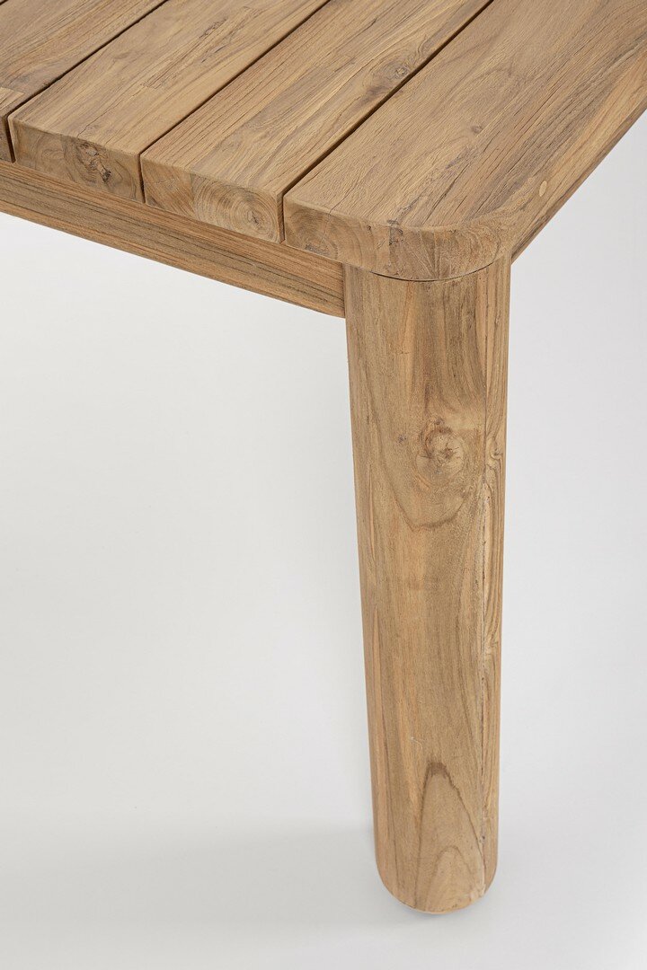PLATEAU ET PIEDS EN TECK RECYCLÉ – SVLK (BOIS CERTIFIÉ PROVENANT DE FORÊTS DURABLES). FINITION BROSSÉE NATURELLE. VISSERIE EN ACIER INOXYDABLE. LE PRODUIT EN BOIS RECYCLÉ EST CARACTÉRISÉ PAR LA PRÉSENCE DE CHEVILLES EN BOIS DE DIFFÉRENTES ESPÈCES ET COULEURS. TOUTES FISSURES OU IMPERFECTIONS, QUI PEUVENT SE PRODUIRE MÊME DANS LE TEMPS, SONT CARACTÉRISTIQUES DE CE MATÉRIAU ET RENDENT CHAQUE PIÈCE UNIQUE ET ORIGINALE. PIEDS À ASSEMBLER. CODE EN COMBINAISON