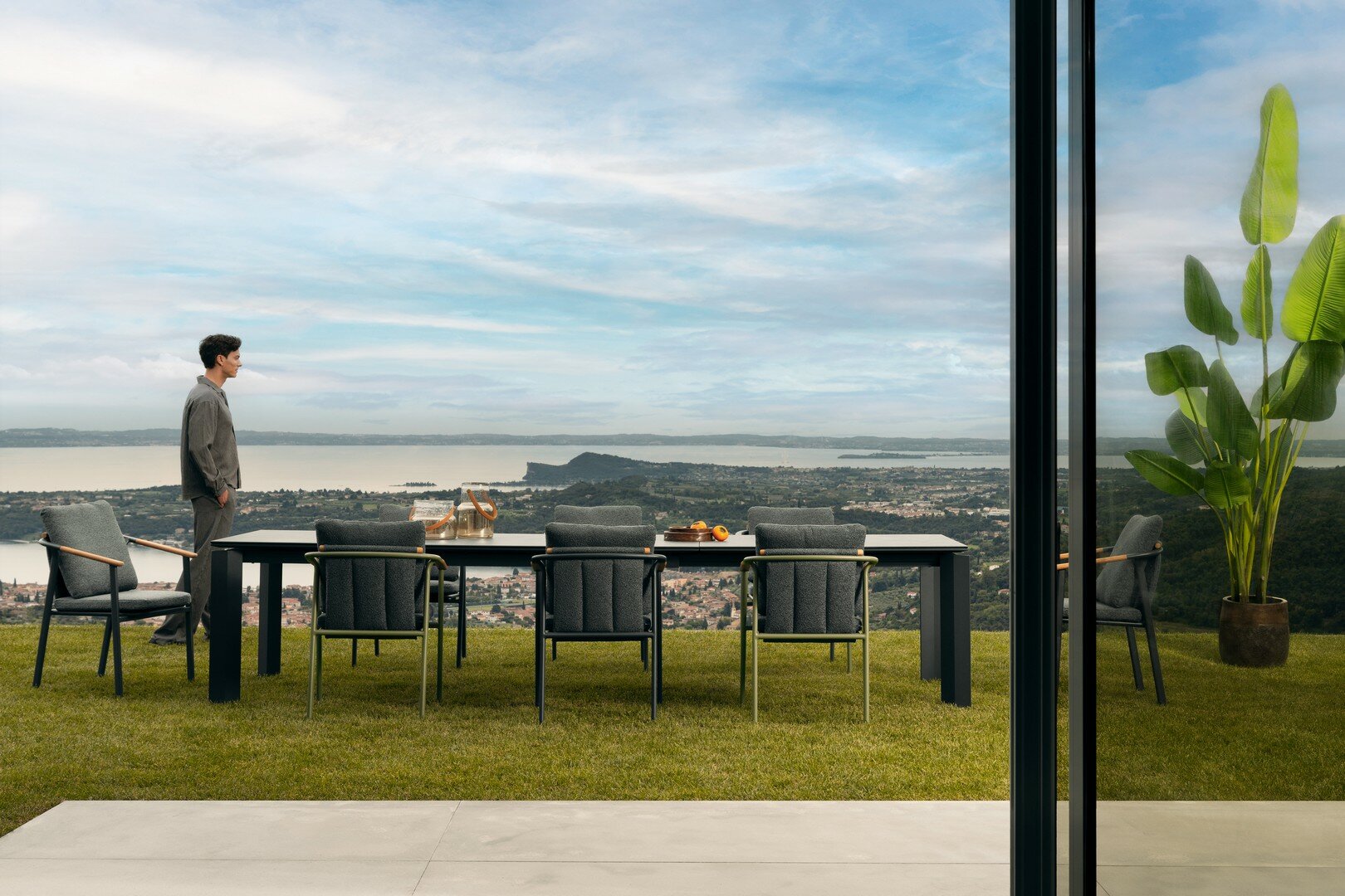 STRUCTURE EN ALUMINIUM PEINT À POUDRE (POLYESTER). PLAN EN CÉRAMIQUE (AVEC BASE EN VERRE) ÉPAISSEUR TOTALE 9MM. EXTENSIBLE AVEC OUVERTURE TÉLESCOPIQUE. RALLONGES EXTÉRIEURES AVEC LOGEMENT SOUS LE PLATEAU. VISSERIE EN ACIER INOXYDABLE.PIEDS À ASSEMBLER