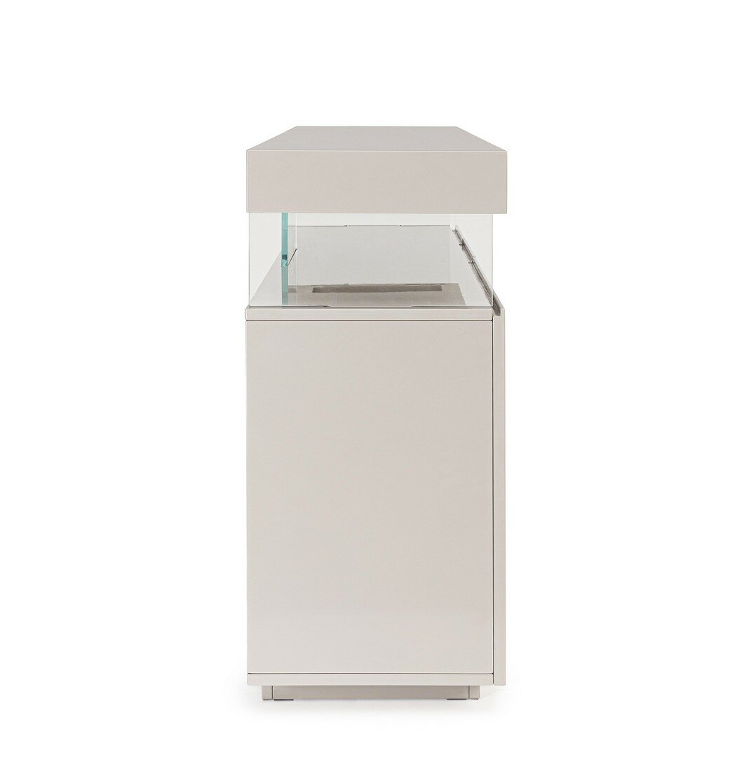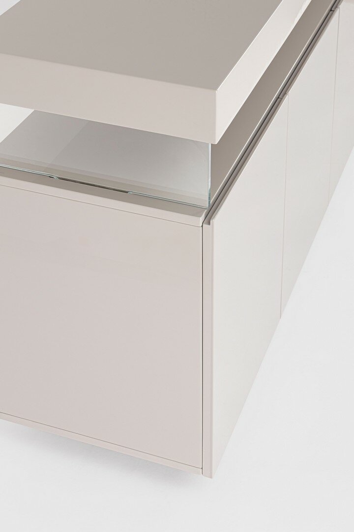 “STRUCTURE EN MDF. FINITION LAQUÉE BRILLANTE À BASE DE PEINTURE POLYURÉTHANE. DOSSIER EN AGGLOMÉRÉ RECOUVERT DE PAPIER MÉLAMINÉ. COMPARTIEIMENT PORTE COMPRENANT ÉTAGÈRE. SUPPORTS PARTIE SUPÉRIEURE EN VERRE TREMPÉ (“”SUPER BLANC””). PORTES AVEC CHARNIÈRES AVEC FERMETURE AMORTIE. SUPPORTS VERRES ET PARTIE SUPÉRIEURE À ASSEMBLER.”