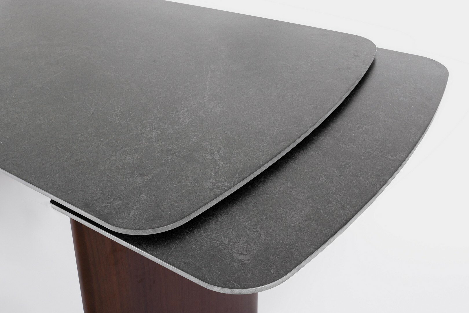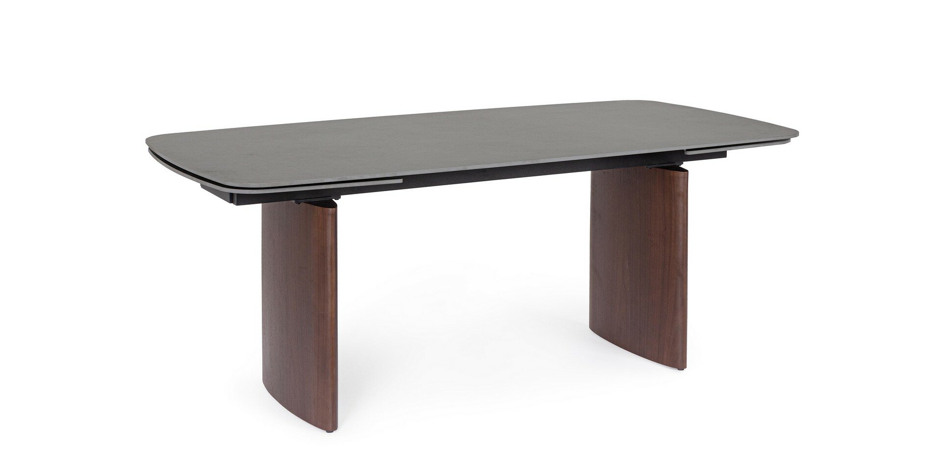 PLATEAU EN GRÈS CÉRAME AVEC EFFET MARBRE. SUPPORTDU PLATEAU EN ACIER LAQUÉ ÉPOXY. PIEDS EN MDF PLAQUÉ BOIS DE NOYER. RALLONGES INDÉPENDANTES. PIEDS RÉGLABLES. PIEDS À ASSEMBLER.
