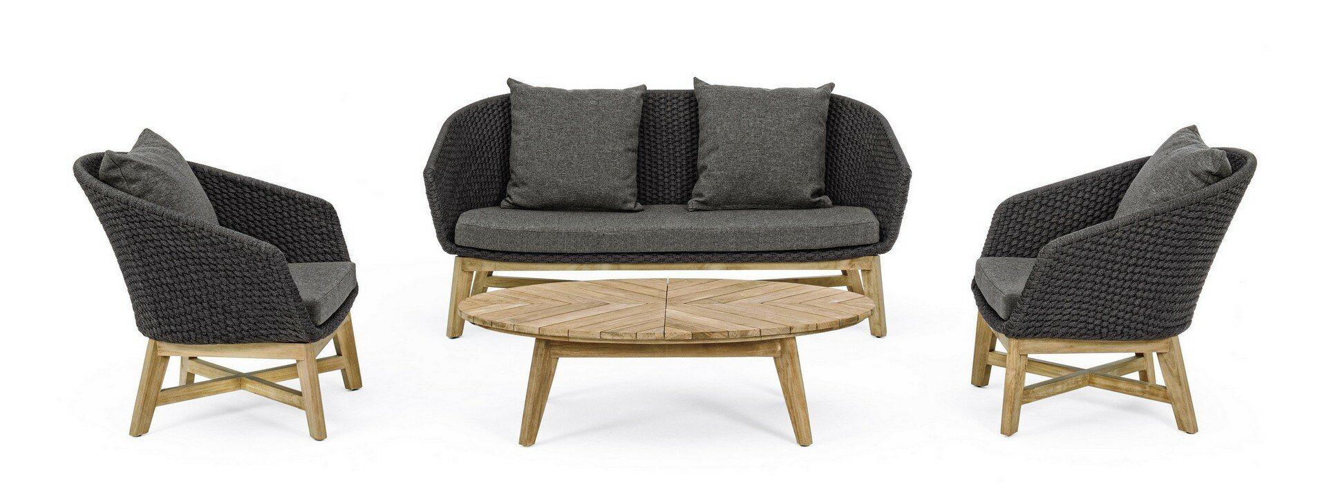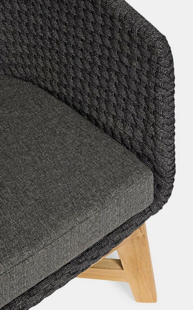 SEDUTA CON STRUTTURA IN ALLUMINIO VERNICIATA A POLVERE (POLIESTERE). INTRECCIO IN CORDA OLEFIN (100% POLIPROPILENE). CUSCINO SEDUTA E SCHIENALE SFODERABILE CON TESSUTO IDROREPELLENTE SUNPROOF OLEFIN (100% POLIPROPILENE). GAMBE IN TEAK – SVLK (LEGNO CERTIFICATO PROVENIENTE DA FORESTE SOSTENIBILI). VITERIA IN ACCIAIO GALVANIZZATO. GAMBE DA ASSEMBLARE. ATTENZIONE: PRIMA DI PROCEDERE AL MONTAGGIO, ASSICURARSI CHE LA NUMERAZIONE SEDUTA-GAMBE COINCIDA.