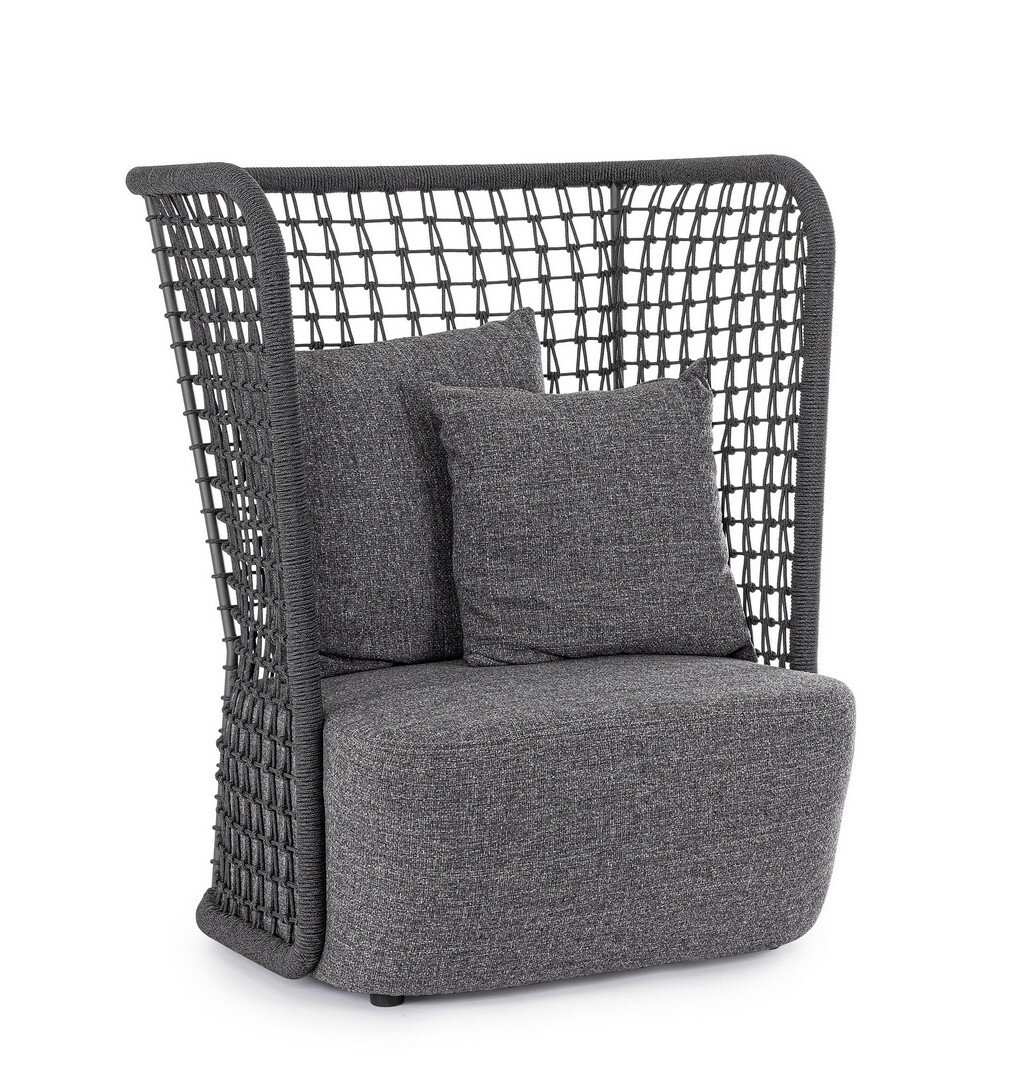 STRUTTURA IN ALLUMINIO VERNICIATO A POLVERE (POLIESTERE). INTRECCIO IN CORDA OLEFIN (100% POLIPROPILENE). SEDUTA CON IMBOTTITURA IMPERMEABILE, RIVESTIMENTO NON SFODERABILE IN TESSUTO PER ESTERNO OLEFIN (100% POLIPROPILENE) IDROREPELLENTE E RESISTENTE AI RAGGI UV (GRADO 7). CUSCINO SCHIENALE SFODERABILE IN TESSUTO IDROREPELLENTE OLEFIN (100% POLIPROPILENE).
