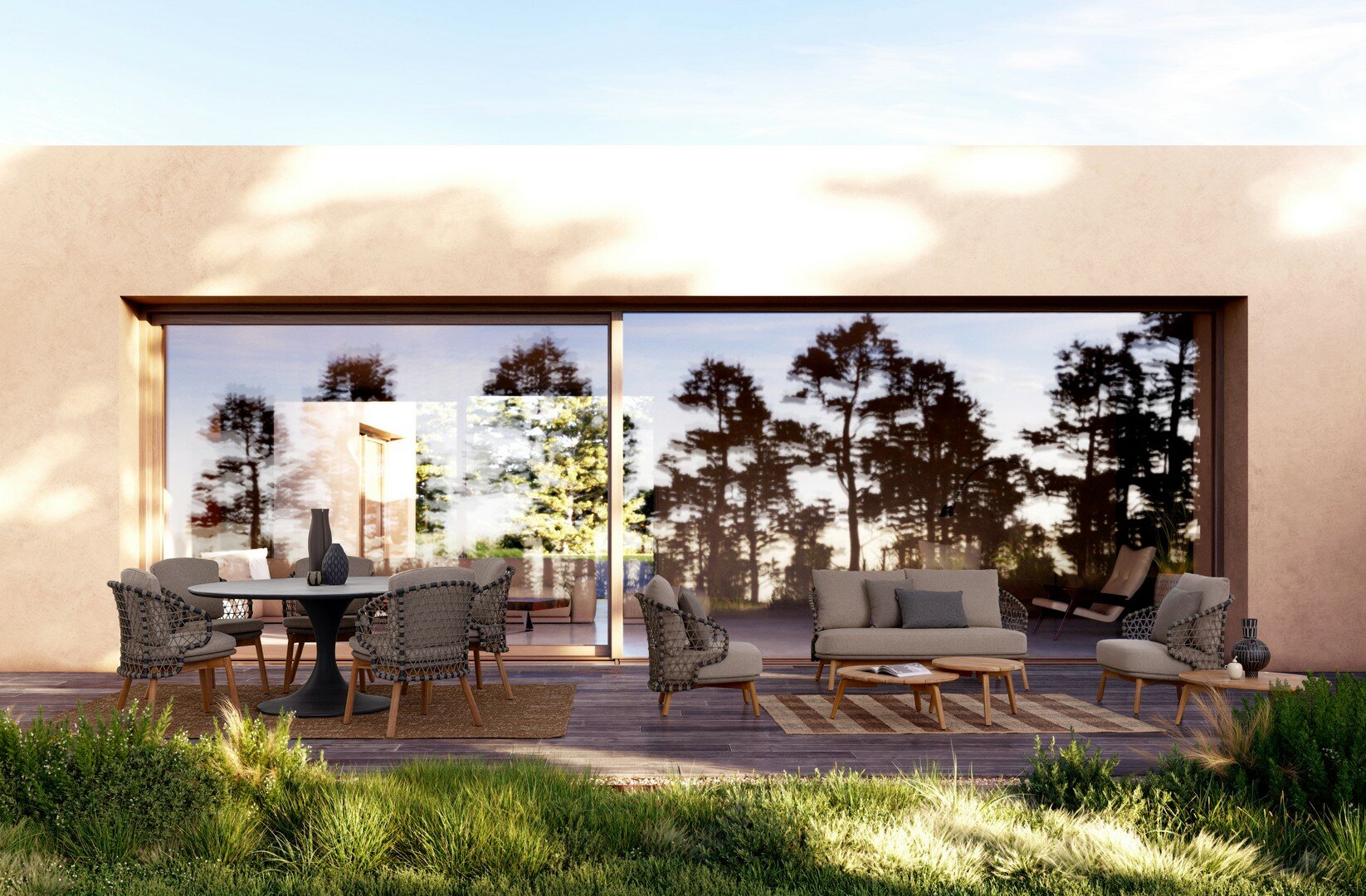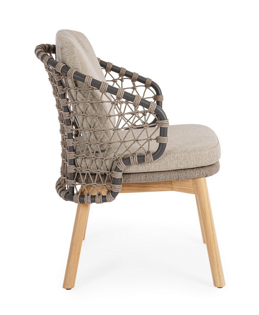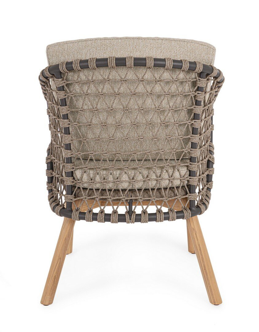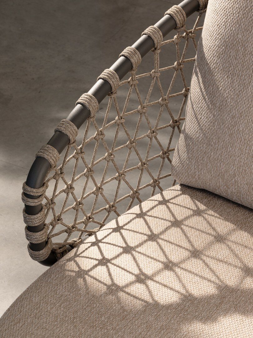 STRUTTURA IN ALLUMINIO VERNICIATA A POLVERE (POLIESTERE). GAMBE IN TEAK – SVLK (LEGNO CERTIFICATO PROVENIENTE DA FORESTE SOSTENIBILI). INTRECCIO PER ESTERNO IN CORDA (POLIPROPILENE). CUSCINI SFODERABILI IN TESSUTO IDROREPELLENTE SUNPROOF OLEFIN (100%POLIPROPILENE). VITERIA IN ACCIAIO INOSSIDABILE. GAMBE DA ASSEMBLARE.