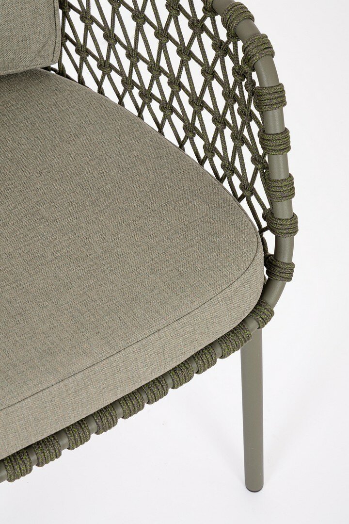 STRUTTURA IN ACCIAIO INOSSIDABILE (201). INTRECCIO PER ESTERNO IN CORDA (POLIPROPILENE). CUSCINI SFODERABILI IN TESSUTO IDROREPELLENTE SUNPROOF OLEFIN (100%POLYPROPYLENE). PER EVITARE FENOMENI DI CORROSIONE, SI SCONSIGLIA DI POSIZIONARE MOBILI CON STRUTTURA IN ACCIAIO INOSSIDABILE 201 IN LUOGHI AD ALTA SALINITÀ ( AMBIENTI MARINI ).