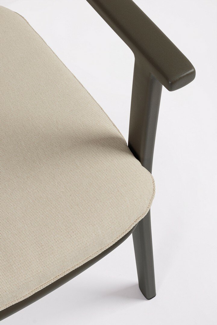 STRUTTURA IN ALLUMINIO VERNICIATO A POLVERE (POLIESTERE). CUSCINO SFODERABILE IN TESSUTO IDROREPELLENTE OLEFIN (100%POLIPROPILENE). (205GR/M2). IMPILABILE.