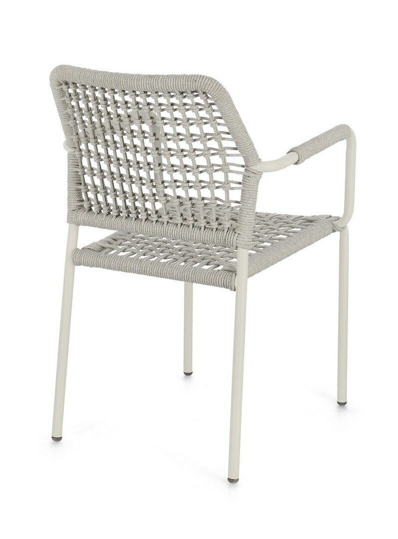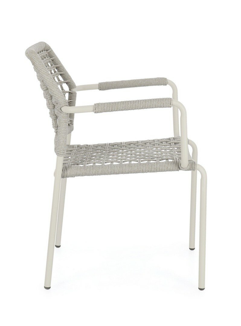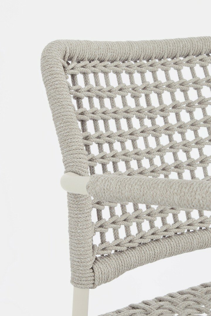 STRUTTURA IN ALLUMINIO VERNICIATA A POLVERE (POLIESTERE). INTRECCIO PER ESTERNO IN CORDA POLIESTERE. IMPILABILE.