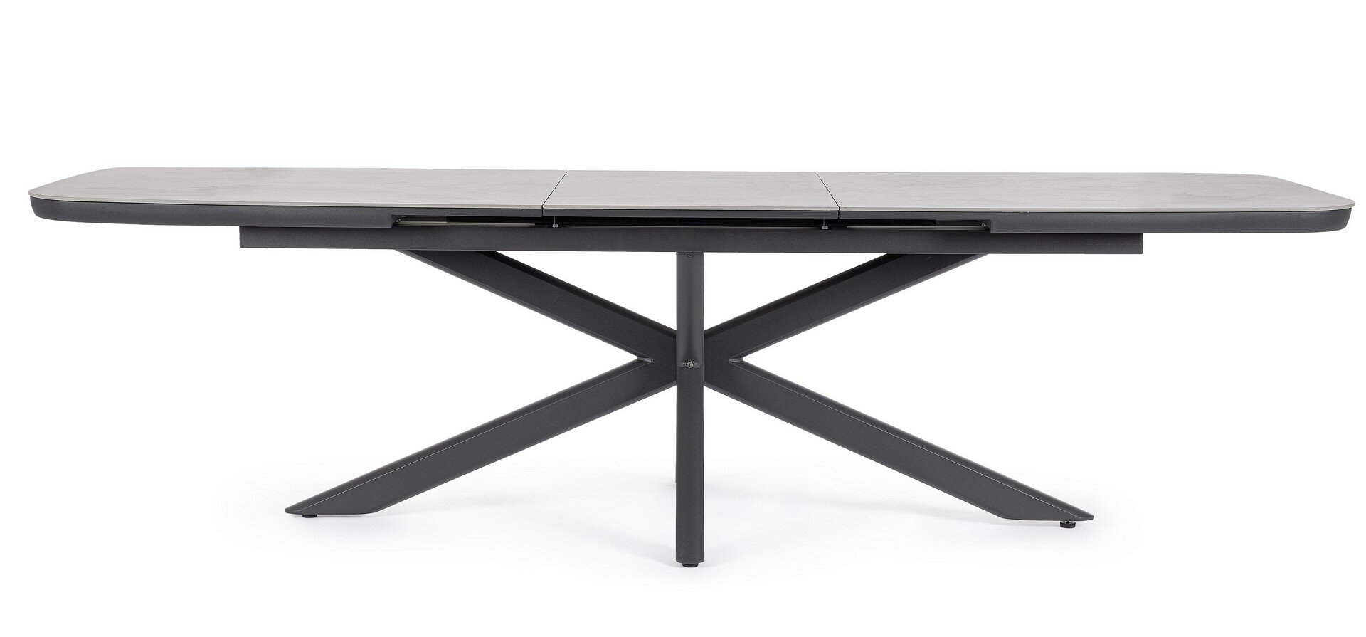 STRUTTURA IN ALLUMINIO VERNICIATA A POLVERE (POLIESTERE). PIANO IN PIETRA SINTERIZZATA (PIETRA NATURALE LAVORATA AD ELEVATE TEMPERATURE)(SPESSORE 11MM) ALLUNGABILE CON PROLUNGA AUTOMATICA. VITERIA IN ACCIAIO INOSSIDABILE. PIEDINI REGOLABILI. GAMBE DA ASSEMBLARE.