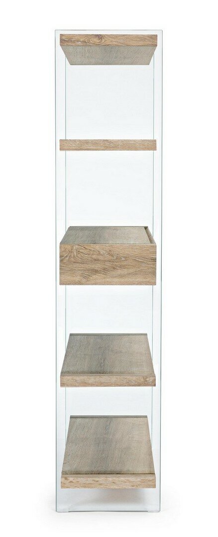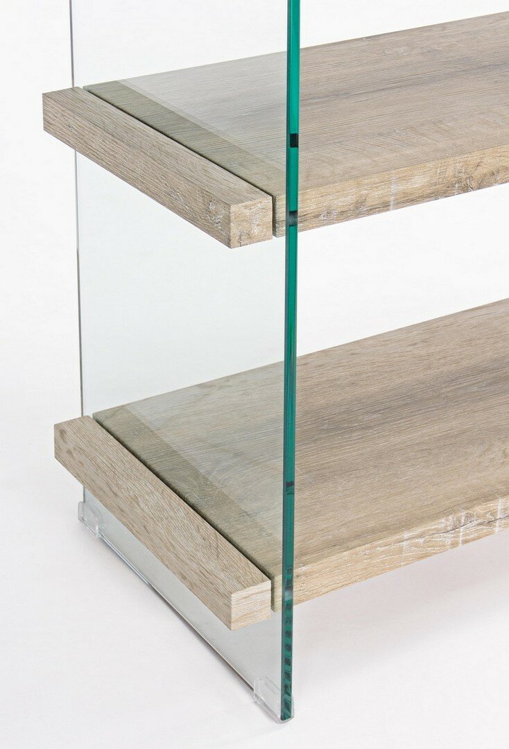 MENSOLE E CASSETTI IN MDF RIVESTITO CON CARTA MELAMINICA EFFETTO LEGNO. FIANCHI IN VETRO TEMPERATO SPESSORE 12MM. PORTATA MAX MENSOLA 2KG. DA ASSEMBLARE.