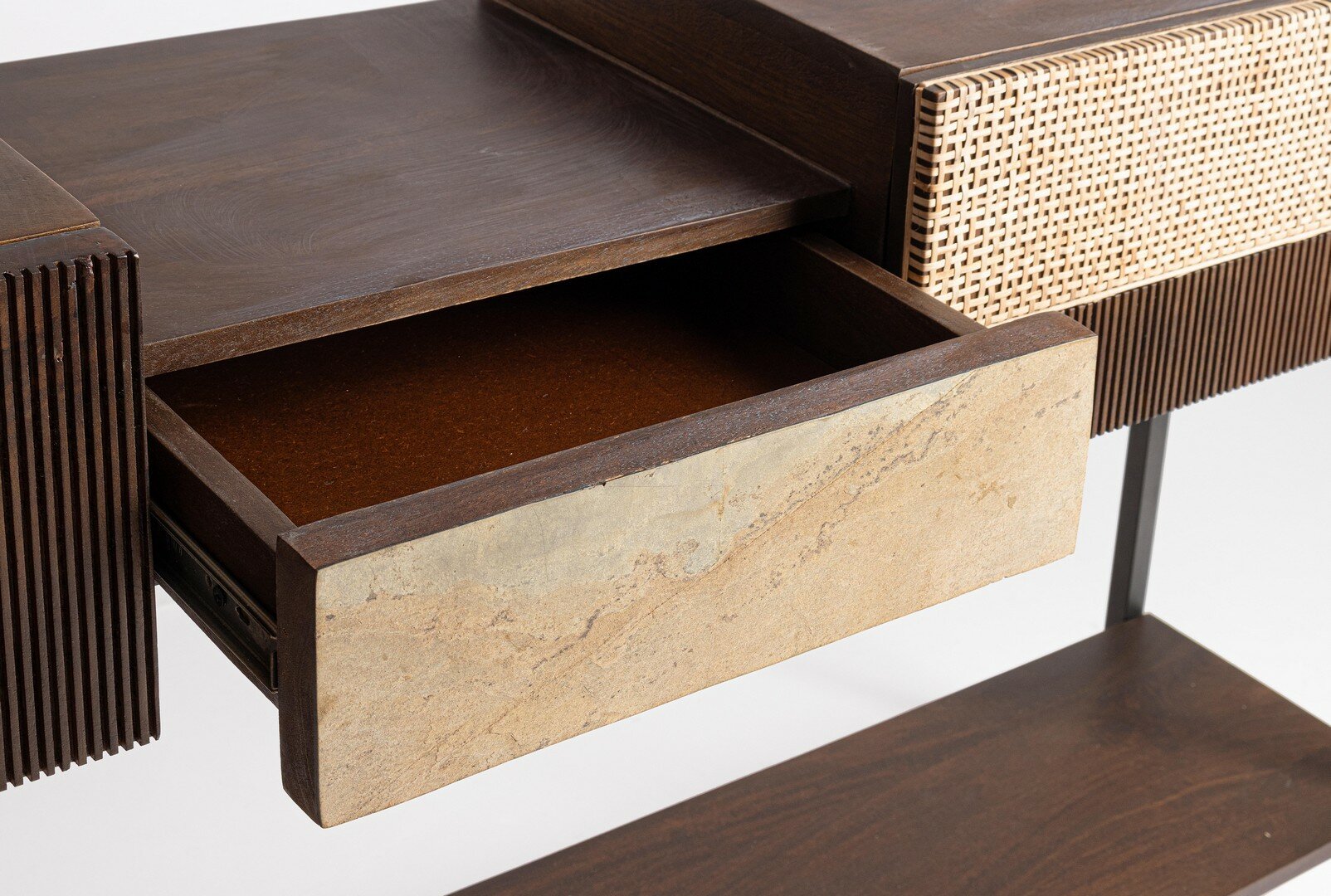 STRUTTURA IN LEGNO DI MANGO, SCHIENALE E STRUTTURA CASSETTI IN MDF, FRONTALE CASSETTI: DUE IMPIALLACCIATO PIETRA NATURALE, UNO LEGNO, UNO CON APPLICAZIONI IN RATTAN. FINITURA CON VERNICE A BASE D’ACQUA. GAMBE IN ACCIAIO VERNICIATO A POLVERE EPOSSIDICA. GAMBE DA ASSEMBLARE.