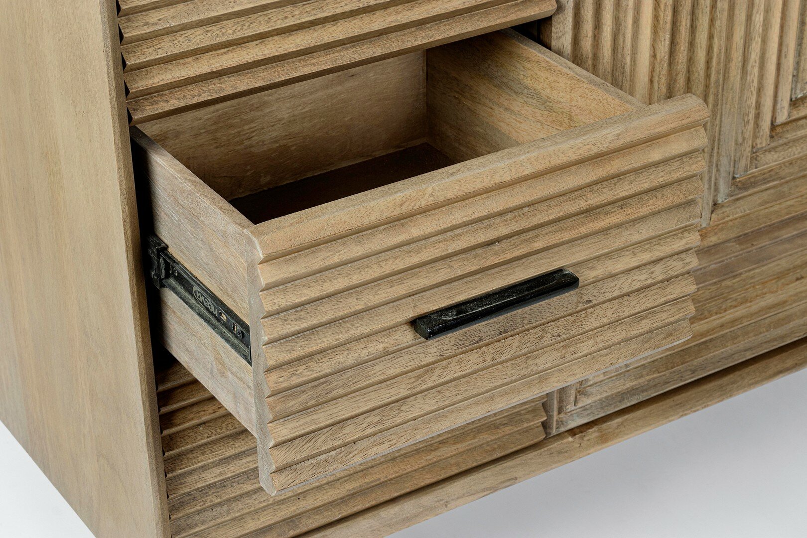 STRUTTURA IN LEGNO DI MANGO, SCHIENALE E FONDO CASSETTI IN MDF. FINITURA CON VERNICE A BASE D’ACQUA. MANIGLIE E GAMBE IN ACCIAIO. VANO PORTA COMPRENSIVO DI MENSOLA. GAMBE DA ASSEMBLARE.