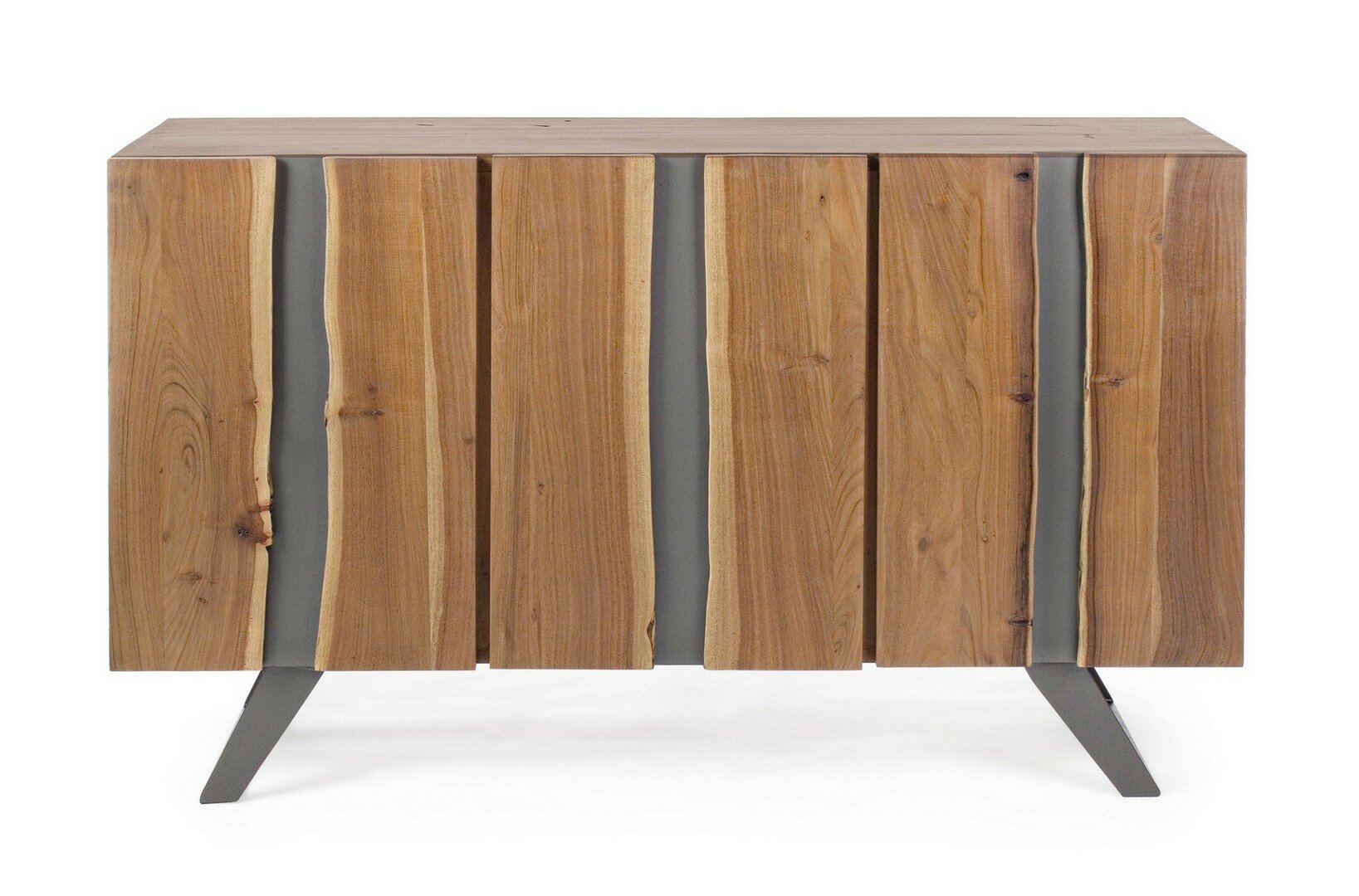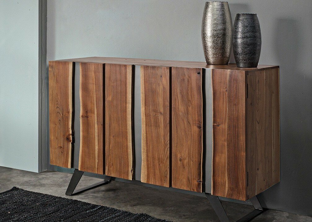 STRUTTURA IN LEGNO DI ACACIA, GAMBE IN ACCIAIO VERNICIATO A POLVERE EPOSSIDICA. PORTE CON INSERTI IN METALLO. FINITURA A BASE DI VERNICE POLIURETANICA. VANO PORTA COMPRENSIVO DI MENSOLA. GAMBE DA ASSEMBLARE.
