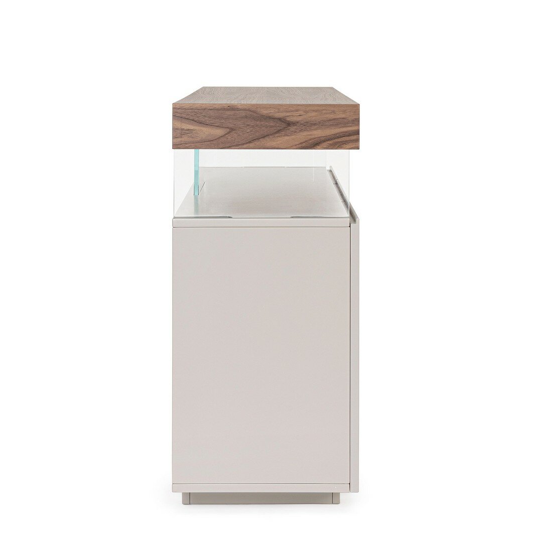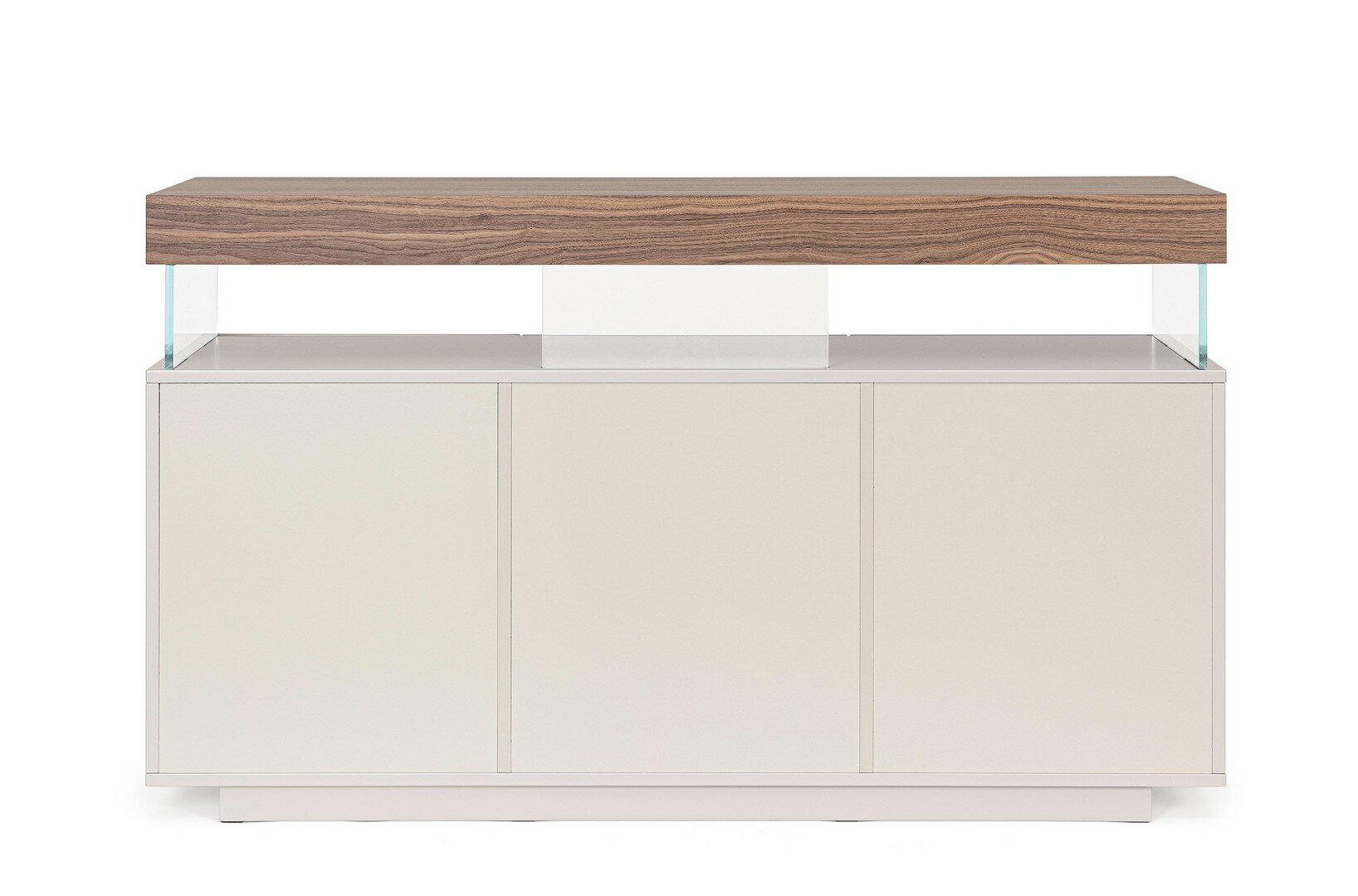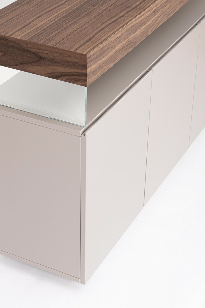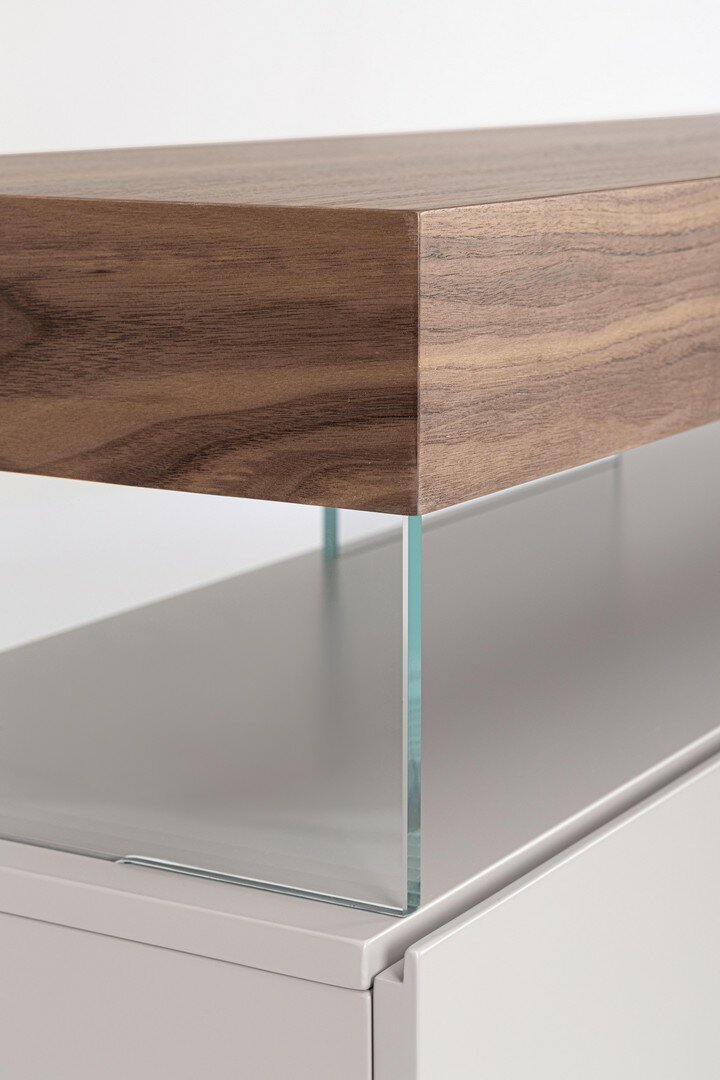 STRUTTURA IN MDF. FINITURA LACCATA OPACA A BASE DI VERNICE POLIURETANICA. PIANO SUPERIORE IMPIALLACCIATO IN LEGNO DI NOCE. SCHIENALE IN TRUCIOLATO RIVESTITO IN CARTA MELAMINICA. VANO ANTA COMPRENSIVO DI MENSOLA. SUPPORTI PIANO SUPERIORE IN VETRO TEMPERATO (“SUPER BIANCO”). ANTE CON CERNIERE CON CHIUSURA AMMORTIZZATA. SUPPORTI VETRI E PIANO SUPERIORE DA ASSEMBLARE.