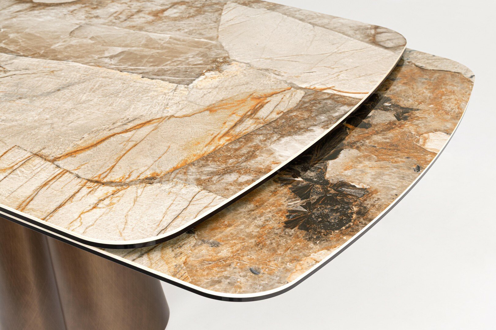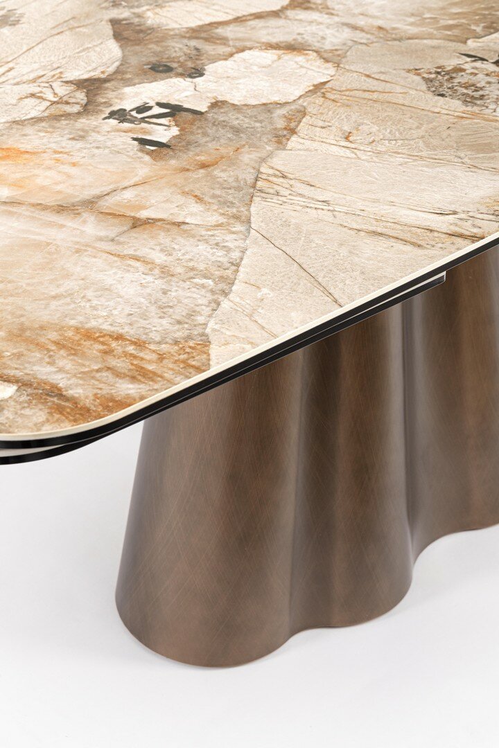 PIANO IN CERAMICA EFFETTO PATAGONIA LUCIDO E STRATO INFERIORE PIANO IN VETRO TEMPERATO. SUPPORTO PIANO IN ACCIAIO VERNICIATO A POLVERE EPOSSIDICA. GAMBE IN ACCIAIO EFFETTO RAME SPAZZOLATO. PROLUNGHE INDIPENDENTI. GAMBA DA ASSEMBLARE.