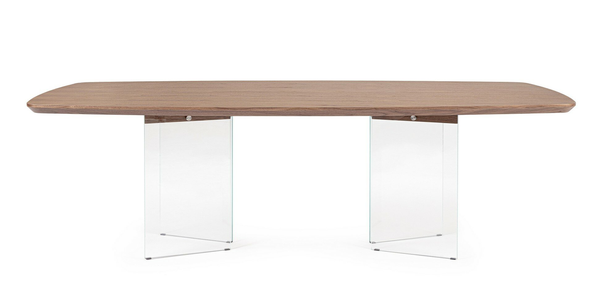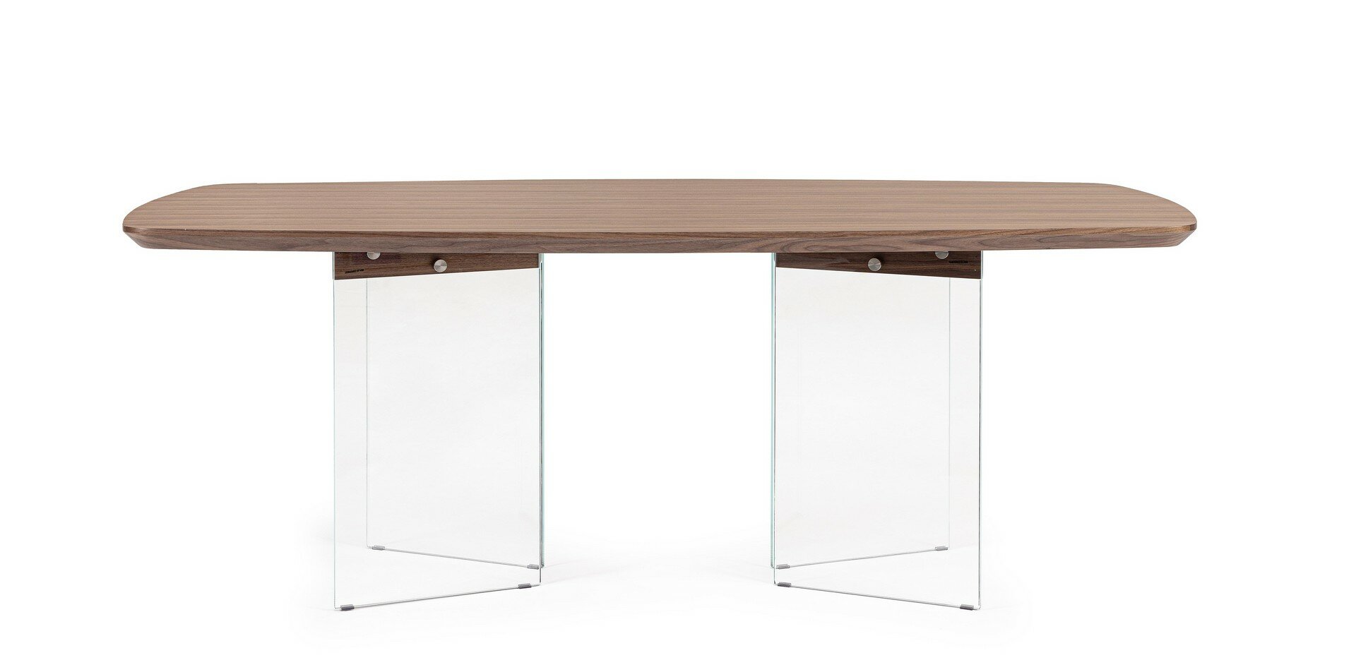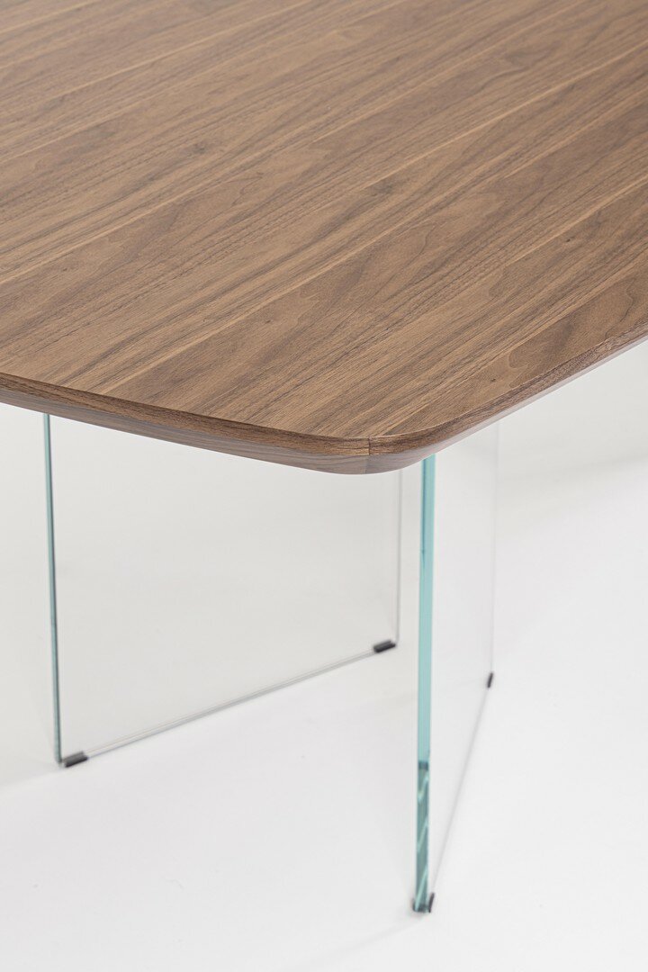 PIANO IN MDF IMPIALLACCIATO LEGNO DI NOCE. FINITURA CON VERNICE A BASE DI ACQUA. GAMBE IN VETRO TEMPERATO (“SUPER BIANCO”). GAMBE DA ASSEMBLARE.